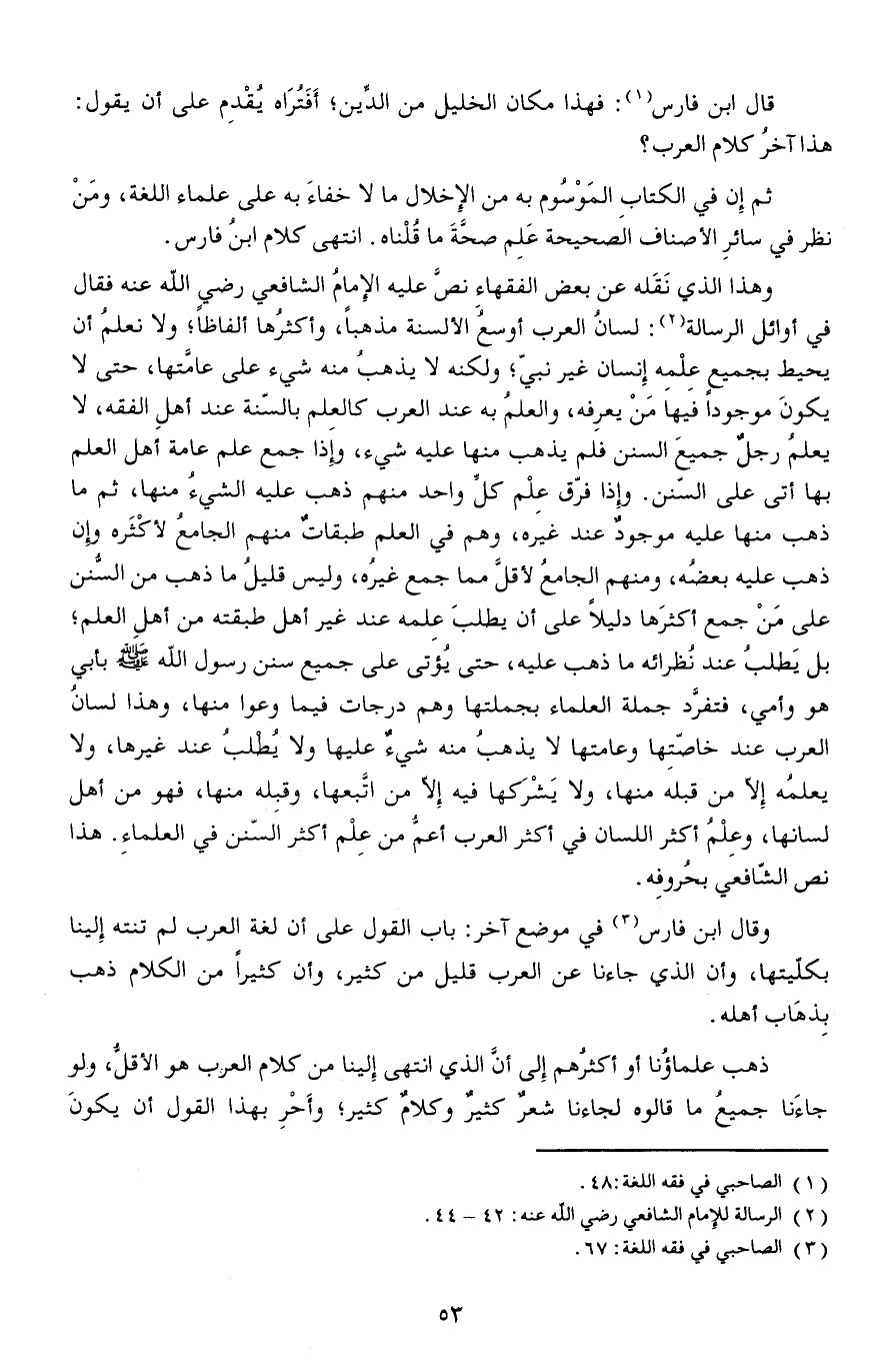وهذا الذى نَقَله عن بعض الفقهاءِ نصَّ عليه الإمامُ الشافعى رضي الله عنه فقال في أوائل الرسالة: لسانُ العرب أوسعُ الألسنة مذهبا وأكثرُها ألفاظا ولا نعلمُ أن يحيط بجميع عِلْمِه إنسان غير نبي ولكنه لا يذهبُ منه شيء على عامَّتها حتى لا يكونَ موجودا فيها مَنْ يعرِفه والعلمُ به عند العرب كالعِلم بالسنة عند أهلِ الفقه لا يعلمُ رجلٌ جميعَ السنن فلم يذهب منها عليه شيء وإذا جمع علم عامة أهل العلم بها أتى على السنن.