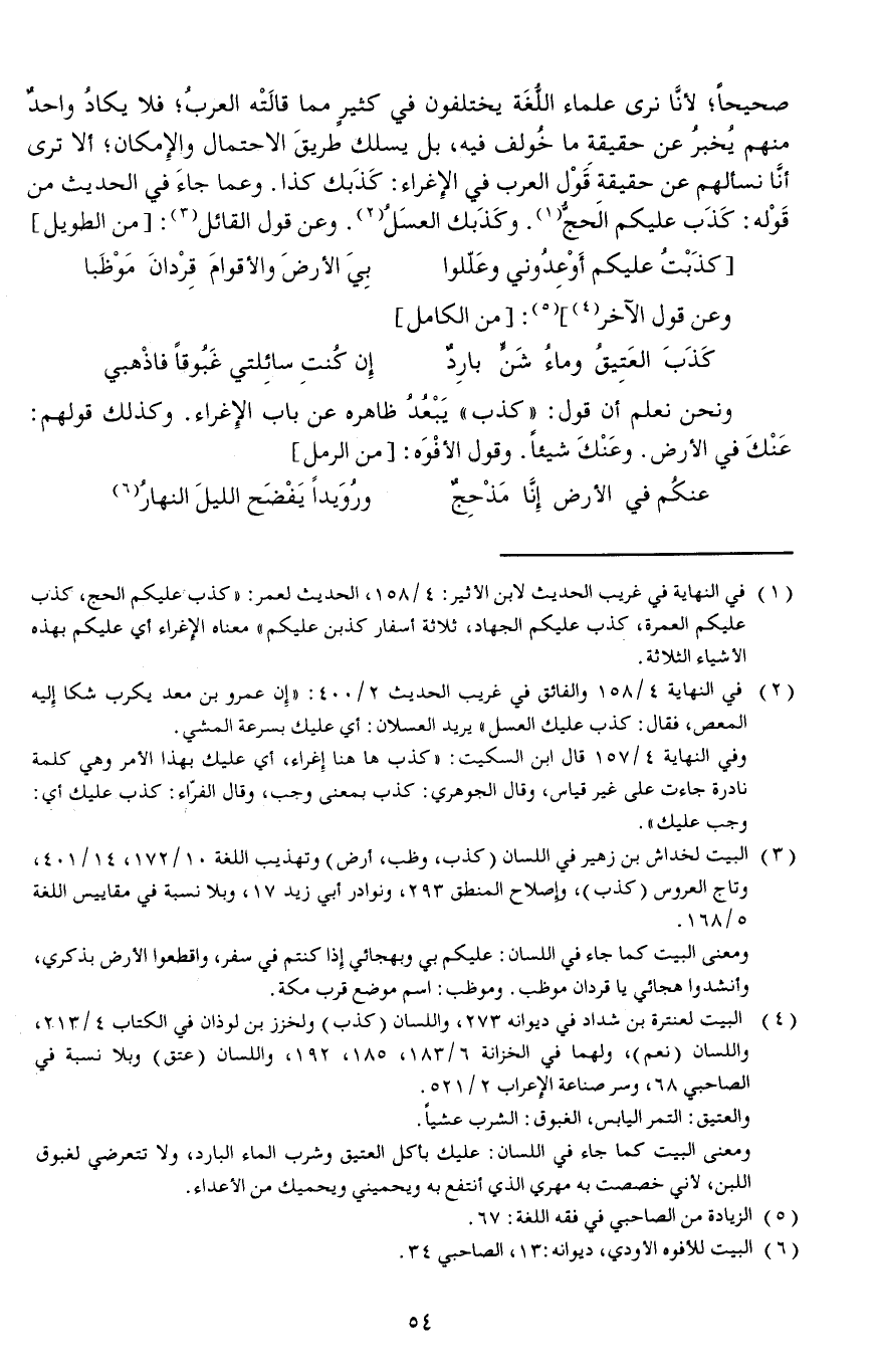 صحيحا لأنَّا نرى علماء اللُّغَة يختلفون في كثيرٍ مما قالَتْه العربُ فلا يكادُ واحدٌ منهم يُخبرُ عن حقيقةِ ما خُولف فيه بل يسلك طريقَ الاحتمال والإمكان ألا ترى أنَّا نسألهم عن حقيقةِ قَوْل العرب في الإغراء: كَذَبك كذا.