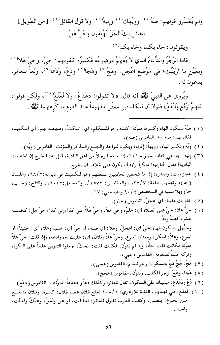 فأما الزَّجْرُ والدُّعاءُ الذي لا يُفهَمُ موضوعُه فكثيرٌ كقولهم: حيَّ وحيَّ هَلا وبعَيْنٍ ما أَرَيَنَّك في مَوْضعِ اعْجل. وهَجْ وهَجَا ودَعْ وَدَعاً ولَعاً للعاثر يدعون له.