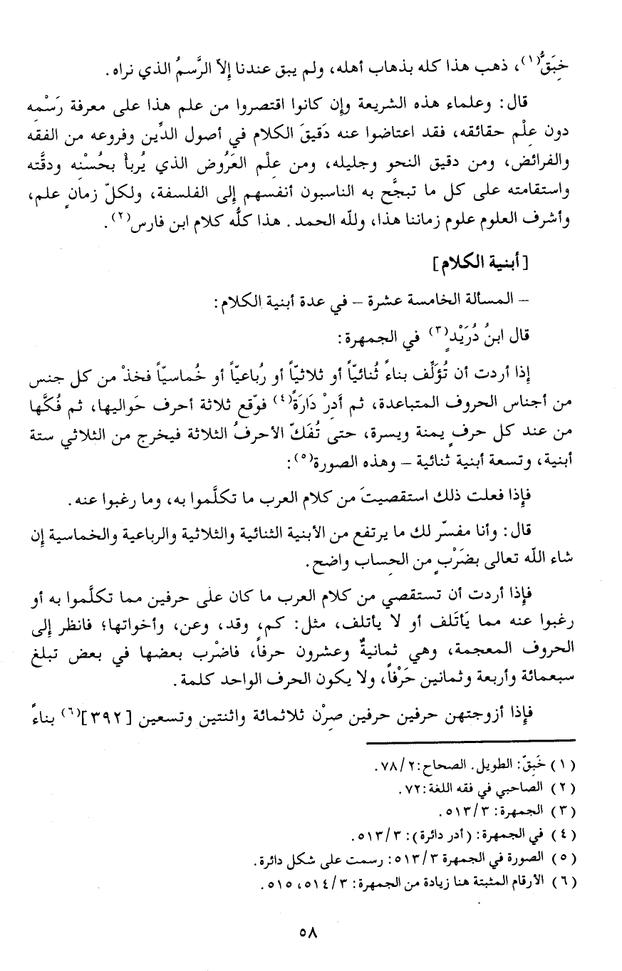 فإذا أردت أن تستقصي من كلام العرب ما كان على حرفين مما تكلَّموا به او رغبوا عنه مما يَأتَلف أو لا يأتلف مثل: كم وقد وعن وأخواتها فانظر إلى الحروف المعجمة وهي ثمانيةٌ وعشرون حرفا فاضْرب بعضها في بعض تبلغ سبعمائة وأربعة وثمانين حَرْفاً ولا يكون الحرف الواحد كلمة.