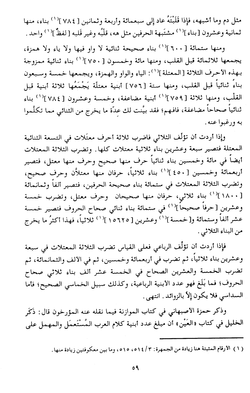 وذكر حمزة الأصبهاني في كتاب الموازنة فيما نقله عنه المؤرخون قال ذَكَر الخليل في كتاب (العَيْن) أن مبلغ عدد أبنية كلام العرب المُسْتَعمَل والمهمل على