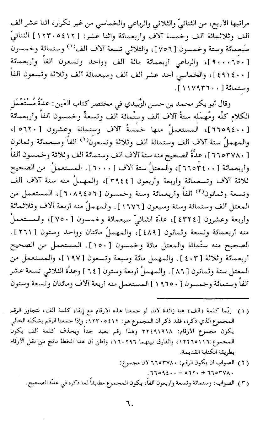 وقال أبو بكر محمد بن حسن الزَّبَيدي في مختصر كتاب العَين: عدّةُ مُسْتَعْمَلِ الكلام كلِّه ومُهمَلِه ستةُ آلاف ألف وسِتِّمائة ألف وتسعةٌ وخمسون ألفا وأربعمائة (6659400) المستعملُ منها خمسةُ آلاف وسِتمائة وعشرون (5620) والمهملُ ستة آلاف ألف وستمائة ألف وثلاثة وتسعون ألفا وسبعمائة وثمانون (6653780) عِدَّةُ الصحيح منه ستة آلاف ألف وستمائة ألف وثلاثة وخمسون ألفا وأربعمائة (6653400) والمعتلَّ ستة آلاف (6000) .