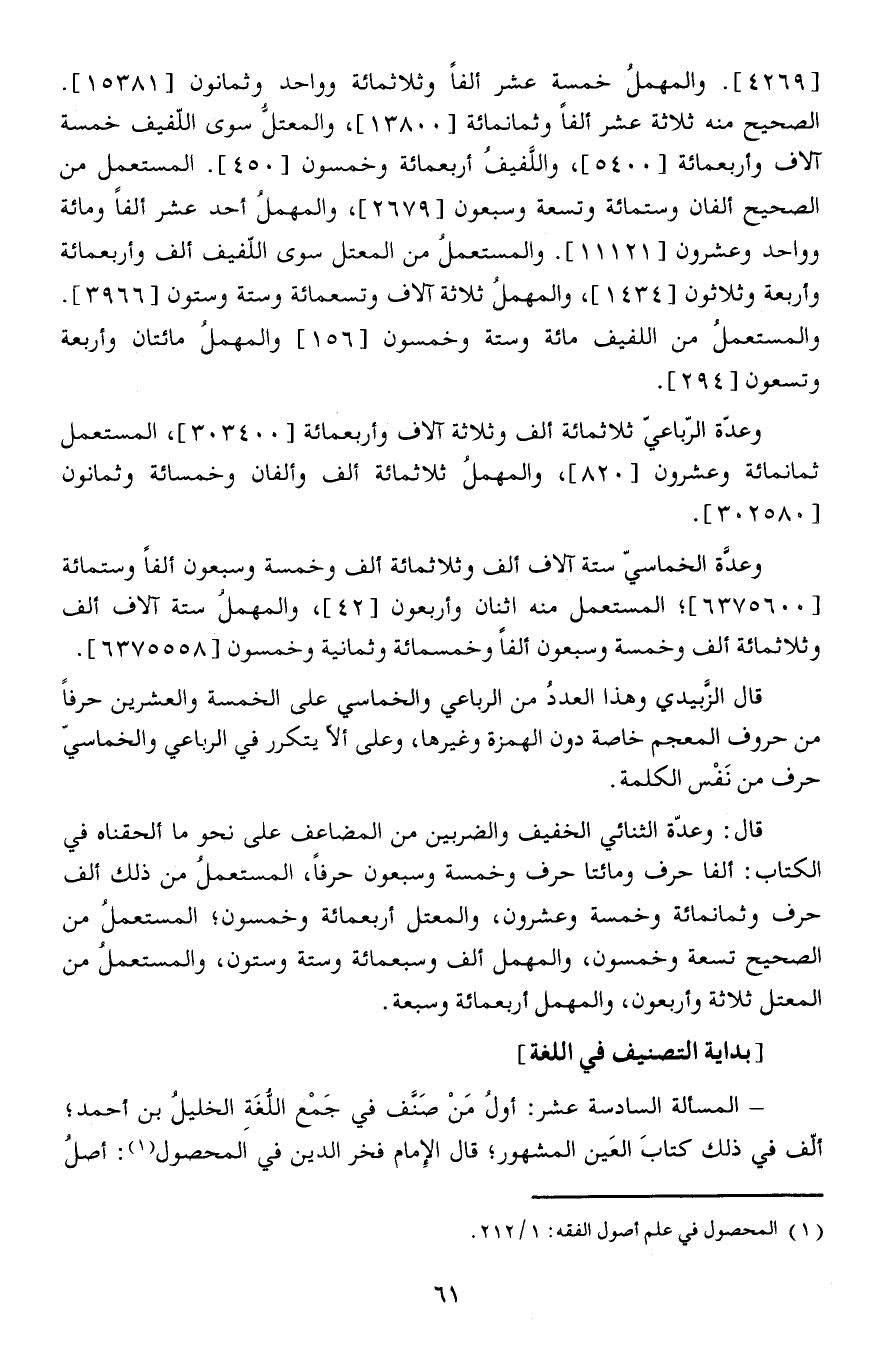 - المسألة السادسة عشر: أولُ مَنْ صَنَّف في جَمْع اللُّغَةِ الخليلُ بن أحمد ألف في ذلك كتابَ العَين المشهور قال الإمام فخر الدين في المحصول: أصل