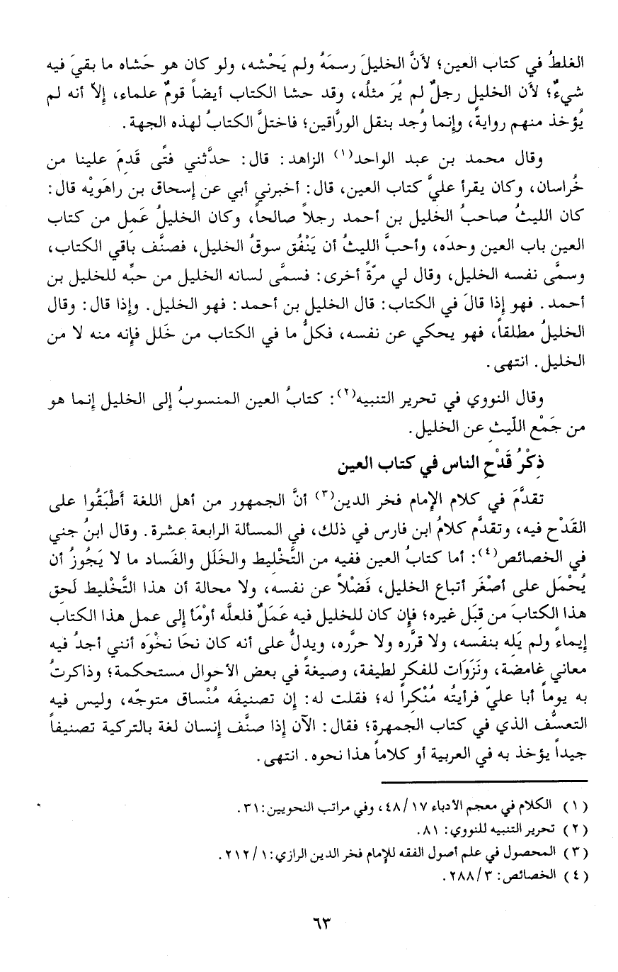 وقال النووي في تحرير التنبيه: كتابُ العين المنسوبُ إلى الخليل إنما هو من جَمْع اللّيثِ عن الخليل.