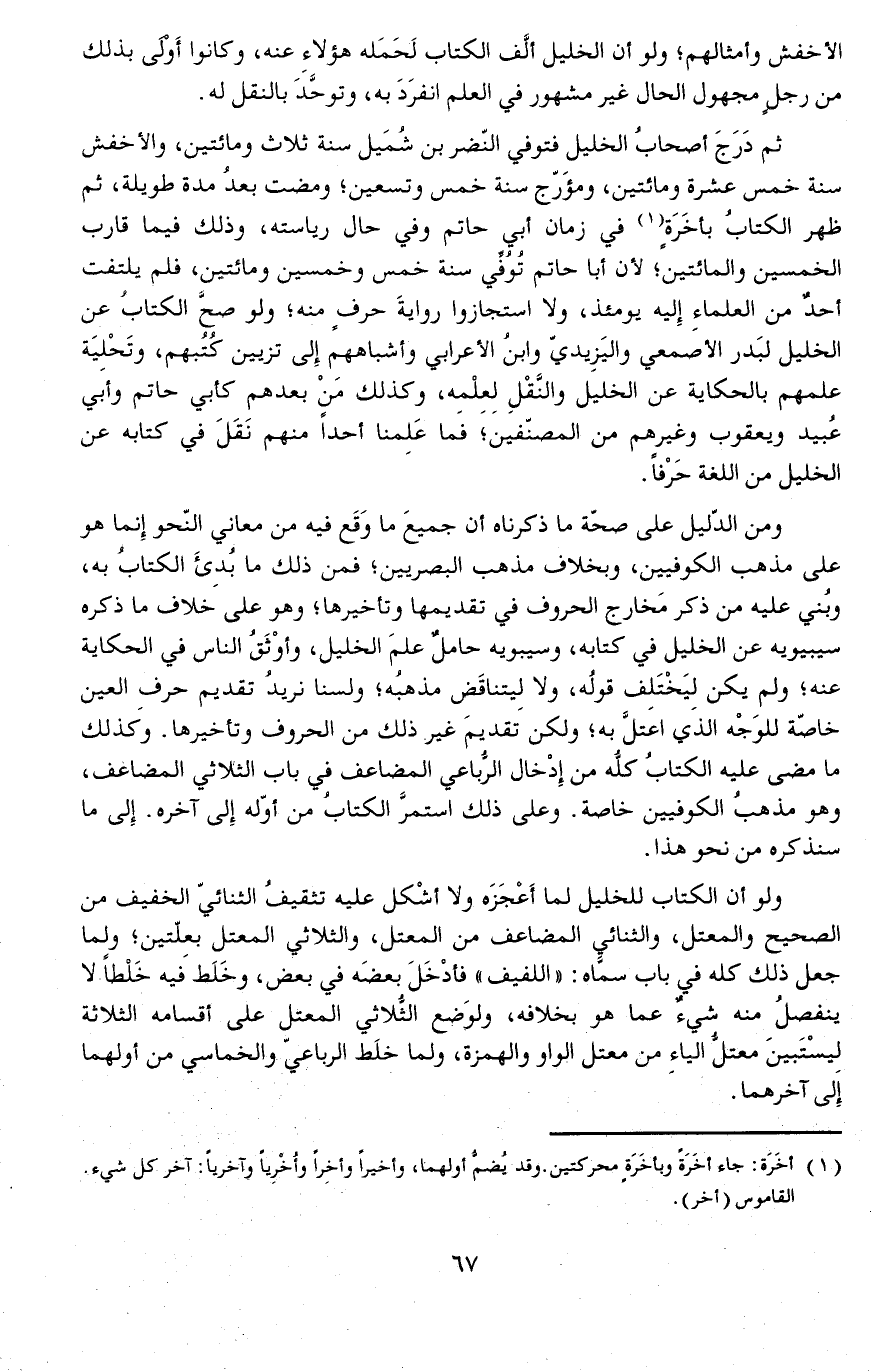 ومن الدليل على صحة ما ذكرناه أن جميعَ ما وَقَع فيه من معاني النحو إنما هو على مذهب الكوفيين وبخلاف مذهب البصريين فمن ذلك ما بدىء الكتابُ به وبُني عليه من ذكر مَخارج الحروف في تقديمها وتأخيرها وهو على خلاف ما ذكره سيبويه عن الخليل في كتابه وسيبويه حاملٌ علمَ الخليل وأوْثَقُ الناس في الحكاية عنه ولم يكن لِيَخْتَلِف قولُه ولا لِيتناقَض مذهبُه ولسنا نريدُ تقديم حرفِ العين خاصة للوَجْه الذي اعتلَّ به ولكن تقديمَ غير ذلك من الحروف وتأخيرها.