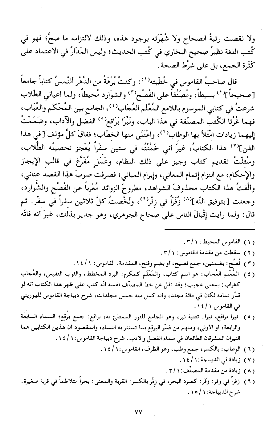 قال صاحبُ القاموس في خُطْبته: وكنتُ بُرْهَةً من الدَّهْر ألتمس كتابا جامعا (صحيحا) بسيطا ومصنفا على الفصح والشوادر مُحيطاً ولما أعياني الطلاب شرعتُ في كتابي الموسوم باللامع المُعْلَم العُجَاب الجامعِ بين المُحْكَم والعُبَاب فهما غُرَّتا الكُتب المصنفة في هذا الباب ونَيِّرَا بَرَاقِع الفضل والآداب وضَمَمْتُ إليهما زيادات امْتَلأَ بها الوطِاب واعْتَلَى منها الخِطَاب ففاقَ كلَّ مؤلف (في هذا الفن) هذا الكتابُ غيرَ أني خَمَّنْتُه في ستين سِفْراً يُعْجز تحصيلُه الطُّلاب وسُئِلْتُ تقديم كتاب وجيز على ذلك النظام وعَمَلٍ مُفَرَّغ في قالَبِ الإيجاز والإحكام مع التزام إتمام المعاني وإبرام المباني فصرفت صوبَ هذا القصد عِناني وألَّفتُ هذا الكتاب محذوفَ الشواهد مطروحَ الزوائد مُعْرِباً عن الفُصُحِ والشَّوارد وجعلت (بتوفيق الله) زُفَرَاً في زِفْر ولَخَّصتُ كلَّ ثلاثين سِفراً في سِفْر.