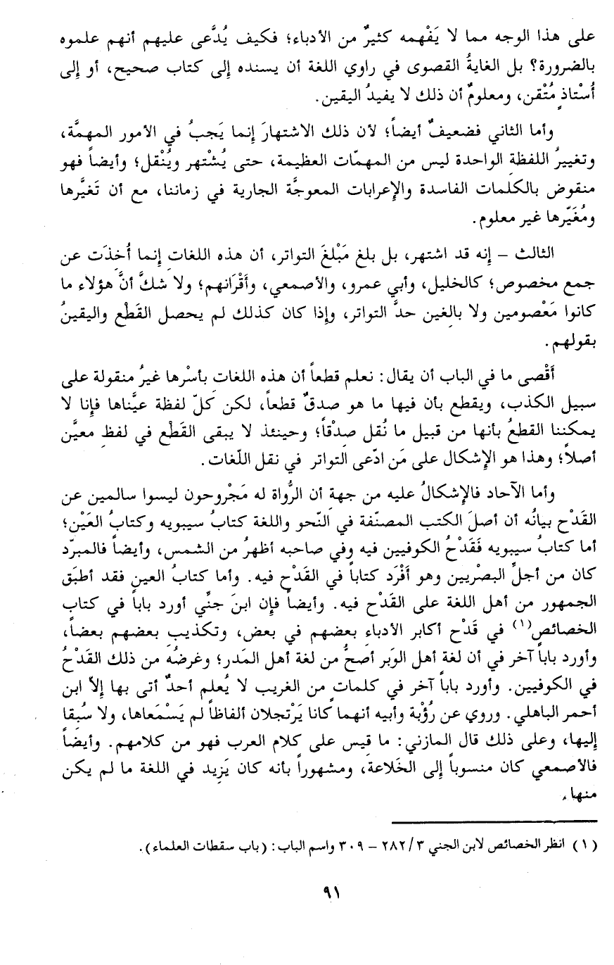 على هذا الوجه مما لا يَفْهمه كثيرٌ من الأدباء فكيف يُدَّعى عليهم أنهم علموه بالضرورة بل الغايةُ القصوى في راوي اللغة أن يسنده إلى كتاب صحيح أو إلى أُسْتاذٍ مُتْقن ومعلومٌ أن ذلك لا يفيدُ اليقين.