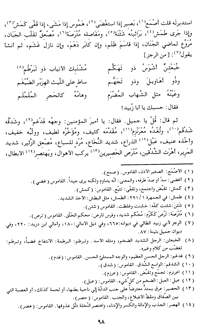 استدبرتَه قلت أَصْمَع بَصِير إذا استغْضَى هَمُوس إذا مَشَى إذا قَفَّى كَمَشَ وإذا جَرى طَمَش بَرَاثِينُه شَثنَة ومَفَاصِله مُتْرَصَة مُصْعِقٌ لقَلْبِ الجَبَان مُرَوِّع لماضي الجَنَان إذا قاسَمَ ظَلَم وإن كابَر دَهَمَ وإن نازل غَشَم ثم أنشأ يقول: // من الرجز //