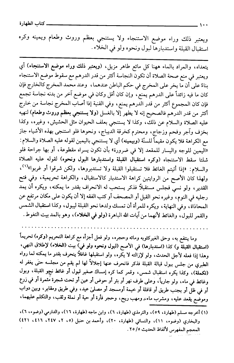 وَيعْتَبر ذَلِك وَرَاء مَوضِع الِاسْتِنْجَاء وَلَا يستنجي بِعظم وروث وَطَعَام وَيَمِينه وَكره اسْتِقْبَال الْقبْلَة واستدبارها لبول وَنَحْوه وَلَو فِي الْخَلَاء.