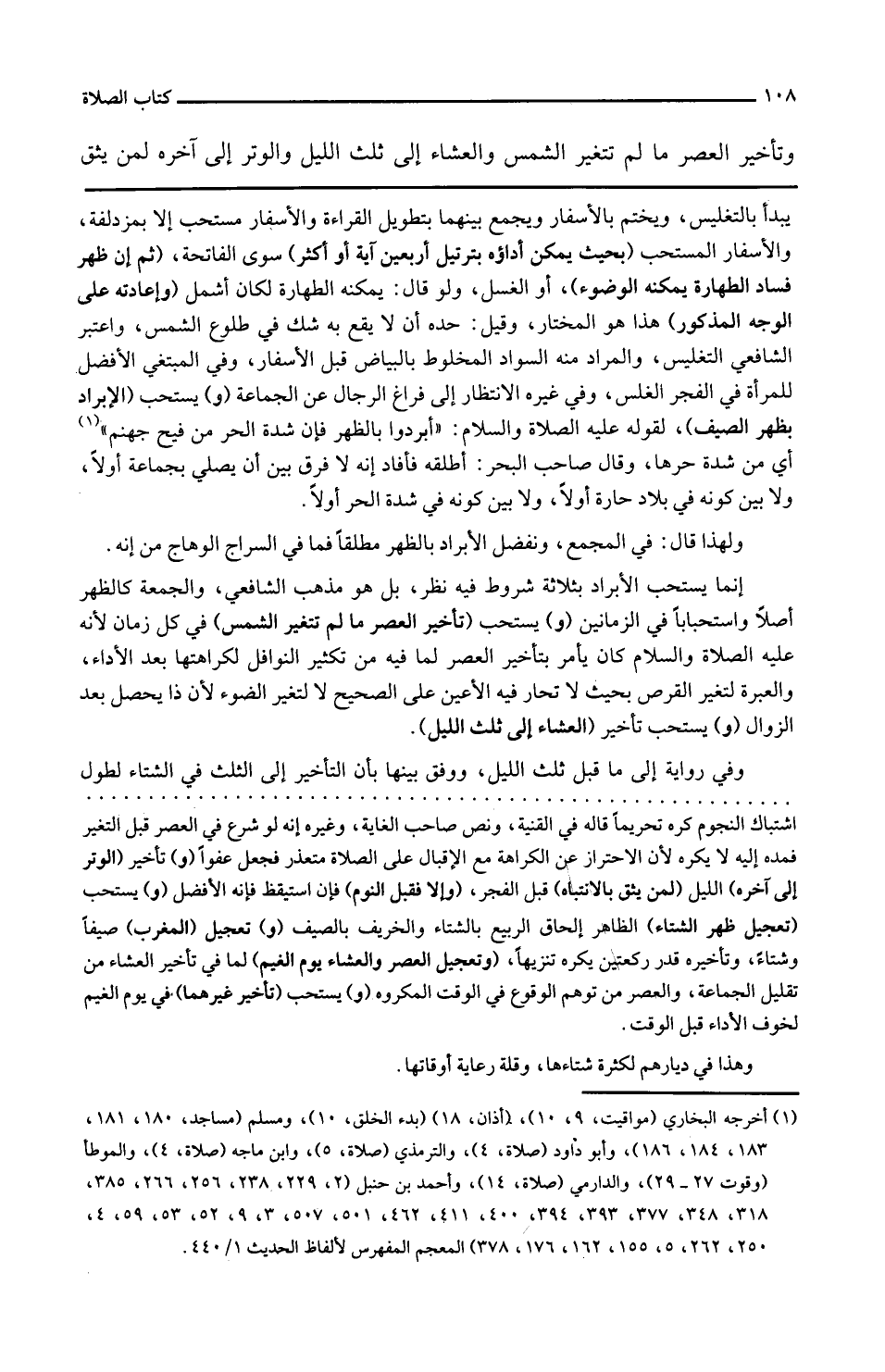 وَتَأْخِير الْعَصْر مَا لم تَتَغَيَّر الشَّمْس وَالْعشَاء إِلَى ثلث اللَّيْل وَالْوتر إِلَى آخِره لمن يَثِق