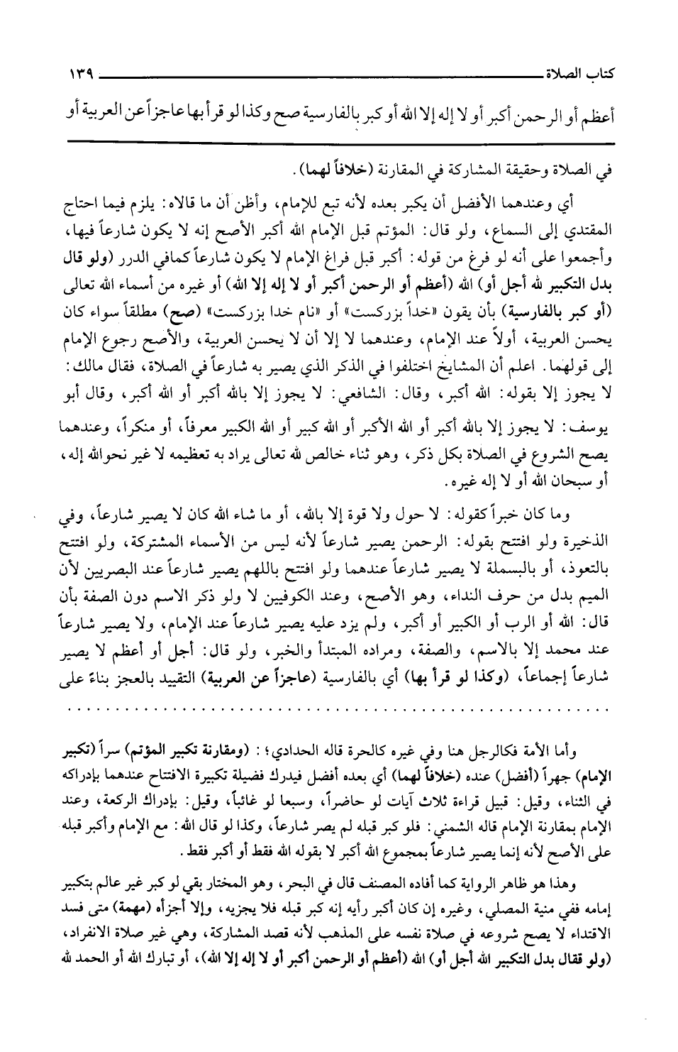 أعظم أَو الرَّحْمَن أكبر أَو لَا إِلَه إِلَّا الله أَو كبر بِالْفَارِسِيَّةِ صَحَّ وَكَذَا لَو قَرَأَ بهَا عَاجِزا عَن الْعَرَبيَّة أَو
