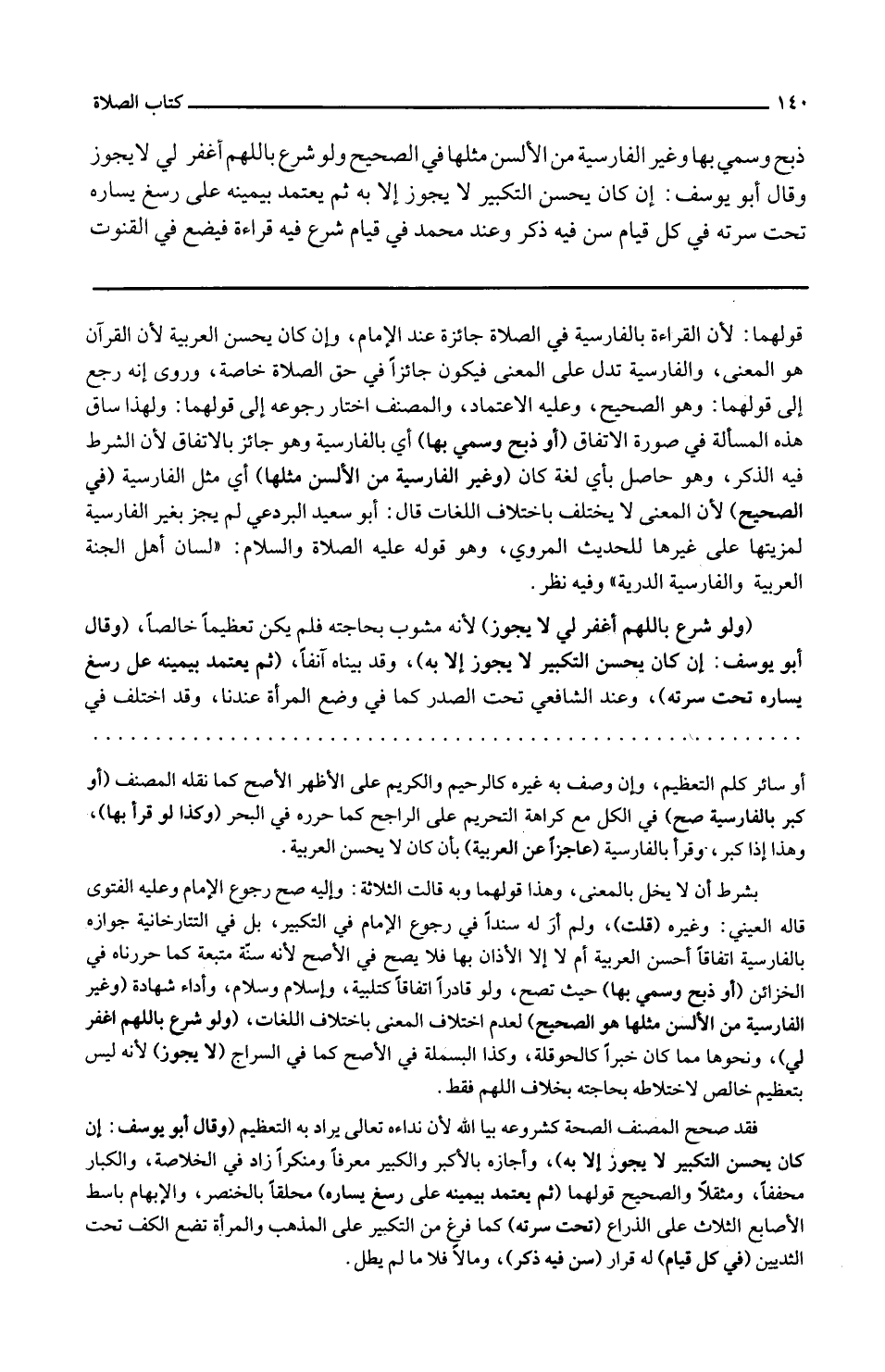 ذبح وَسمي بهَا وَغير الفارسية من الألسن مثلهَا فِي الصَّحِيح وَلَو شرع باللهم أَغفر لي لَا يجوز وَقَالَ أَبُو يُوسُف: إِن كَانَ يحسن التَّكْبِير لَا يجوز إِلَّا بِهِ ثمَّ يعْتَمد بِيَمِينِهِ على رسغ يسَاره تَحت سرته فِي كل قيام سنّ فِيهِ ذكر وَعند مُحَمَّد فِي قيام شرع فِيهِ قِرَاءَة فَيَضَع فِي الْقُنُوت