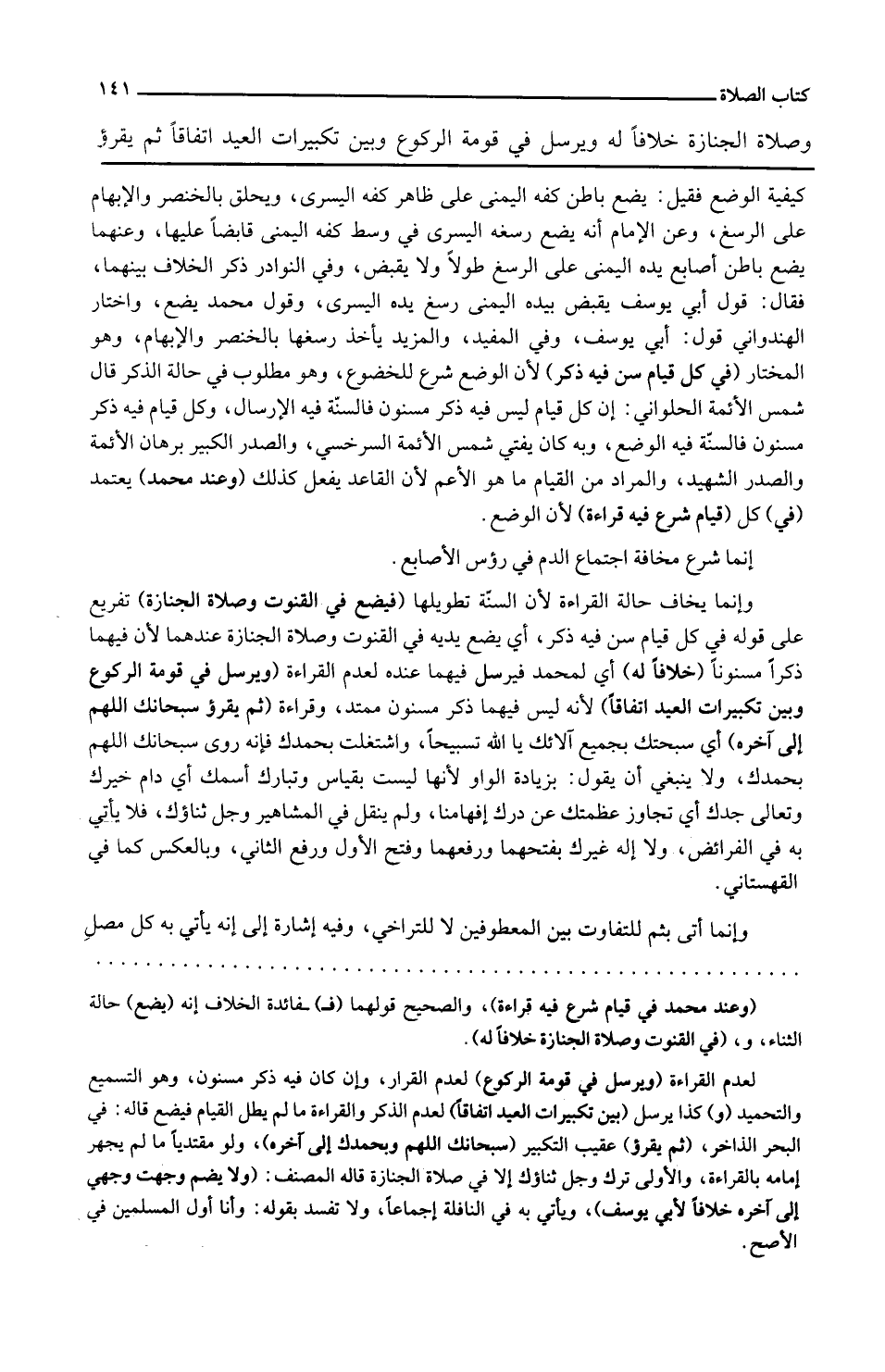 وَصَلَاة الْجِنَازَة خلافًا لَهُ وَيُرْسل فِي قومة الرُّكُوع وَبَين تَكْبِيرَات الْعِيد اتِّفَاقًا ثمَّ يقرؤ