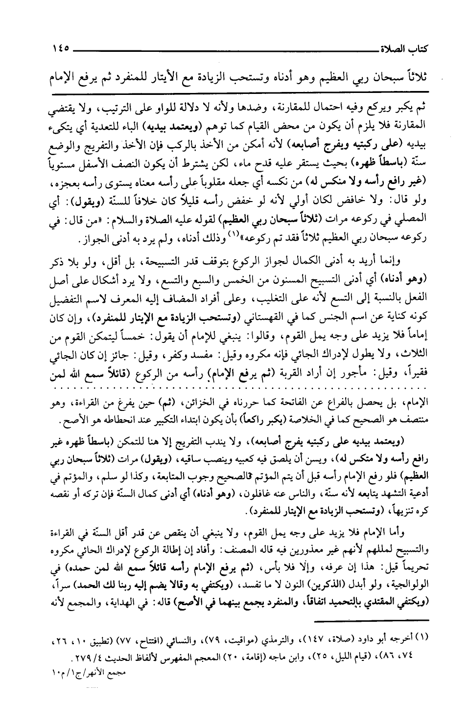 ثَلَاثًا سُبْحَانَ رَبِّي الْعَظِيم وَهُوَ أدناه وتستحب الزِّيَادَة مَعَ الأيتار للمنفرد ثمَّ يرفع الإِمَام