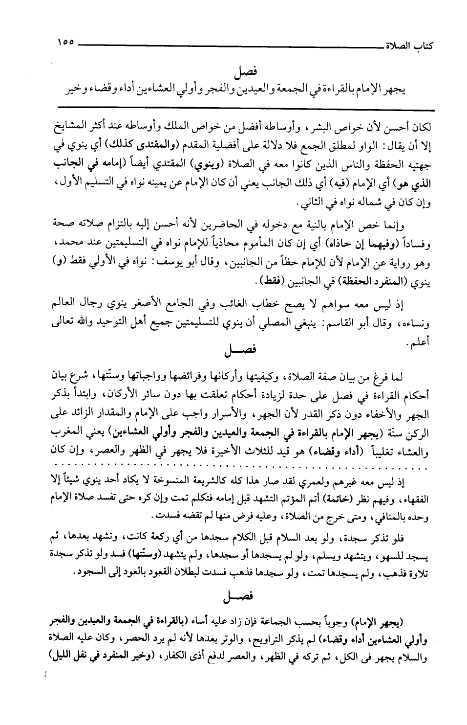 يجْهر الإِمَام بِالْقِرَاءَةِ فِي الْجُمُعَة وَالْعِيدَيْنِ وَالْفَجْر وأولي العشاءين أَدَاء وَقَضَاء وَخير