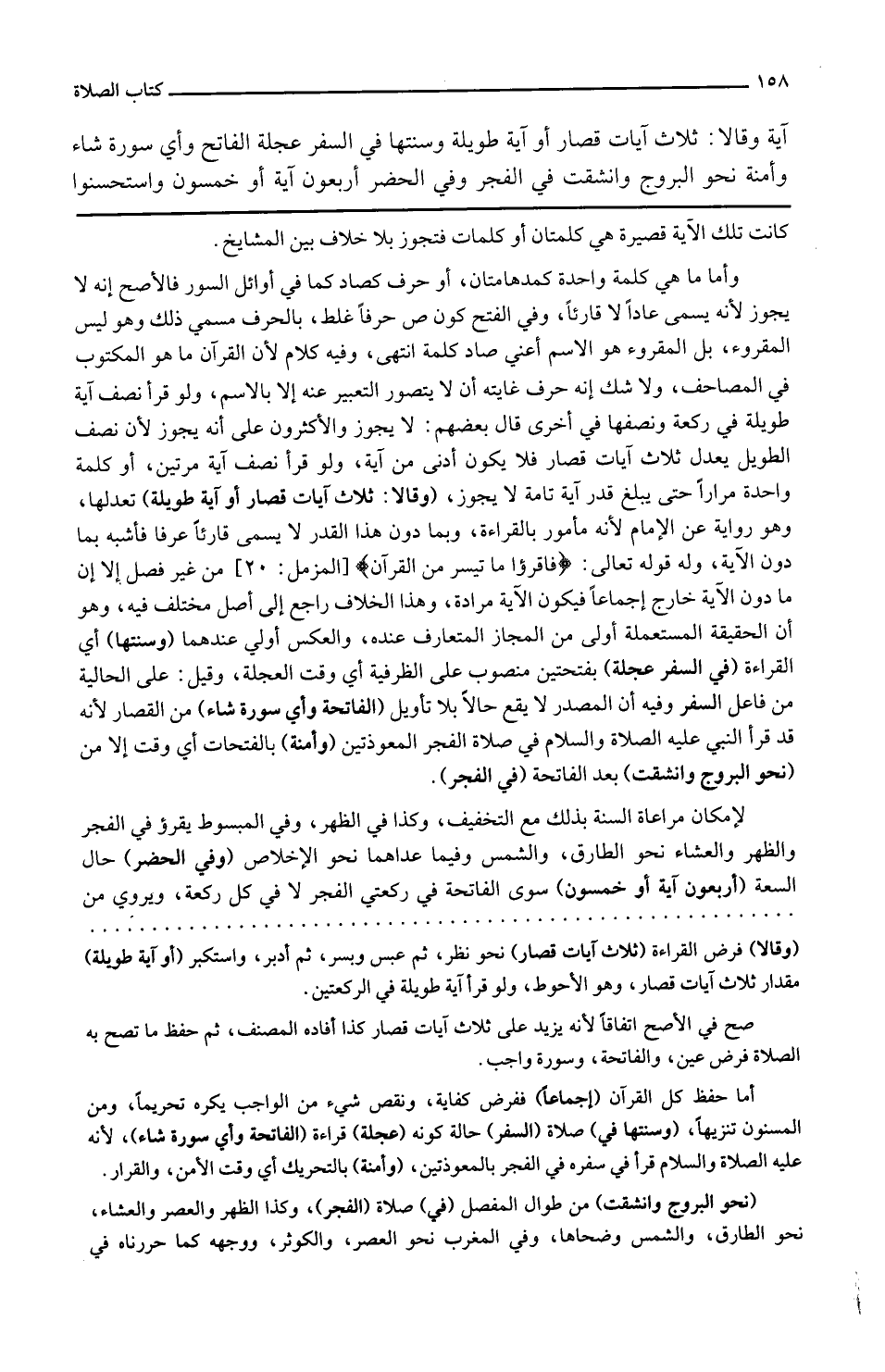 آيَة وَقَالا: ثَلَاث آيَات قصار أَو آيَة طَوِيلَة وسنتها فِي السّفر عجلة الفاتح وَأي سُورَة شَاءَ وأمنة نَحْو البروج وانشقت فِي الْفجْر وَفِي الْحَضَر أَرْبَعُونَ آيَة أَو خَمْسُونَ واستحسنوا