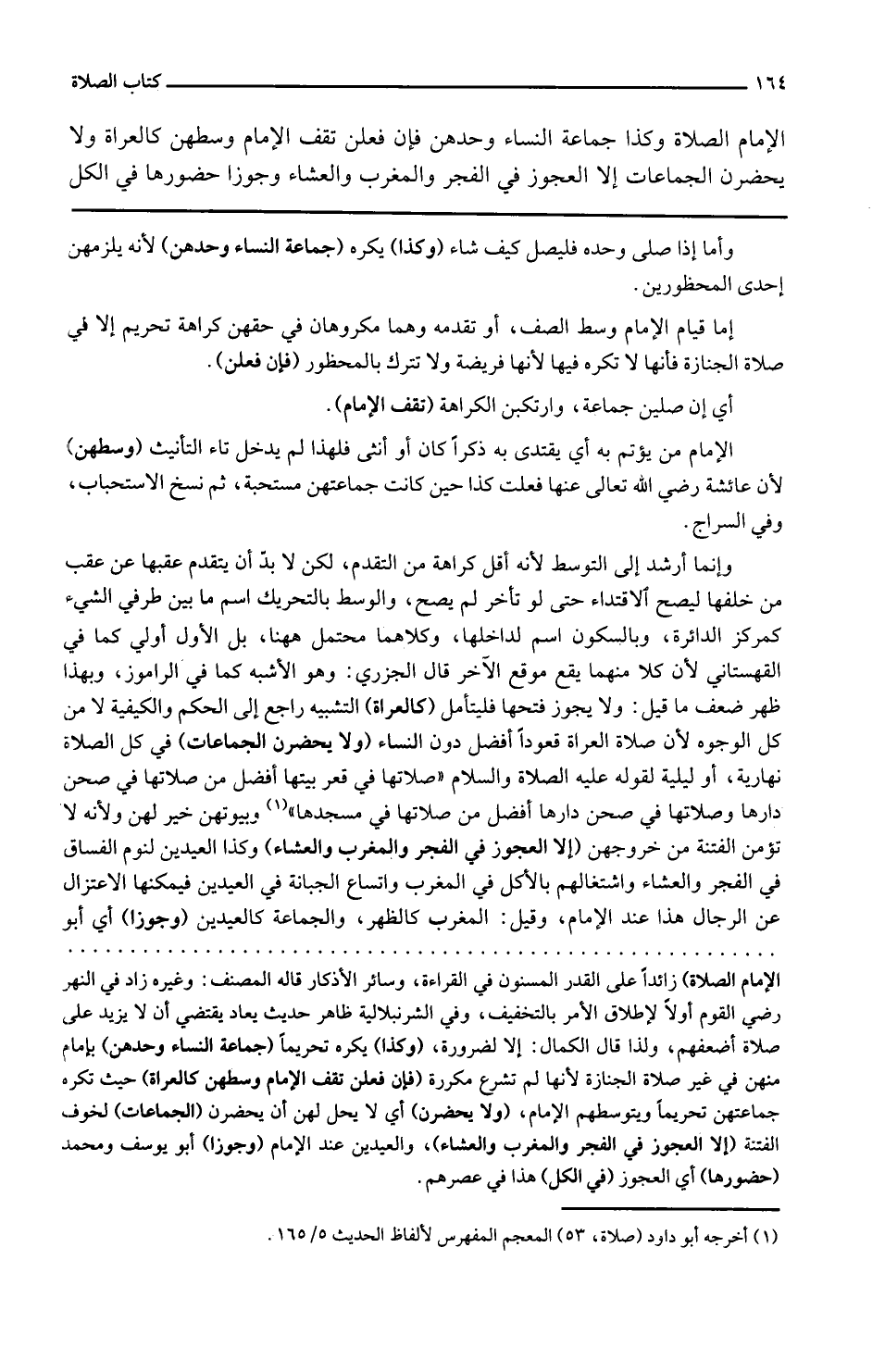 الإِمَام الصَّلَاة وَكَذَا جمَاعَة النِّسَاء وحدهن فَإِن فعلن تقف الإِمَام وسطهن كالعراة وَلَا يحضرن الْجَمَاعَات إِلَّا الْعَجُوز فِي الْفجْر وَالْمغْرب وَالْعشَاء وجوزا حُضُورهَا فِي الْكل