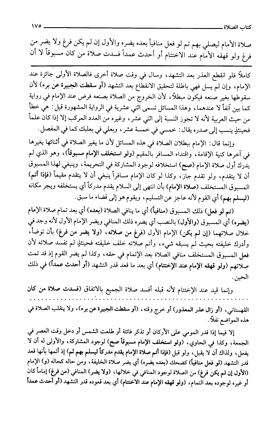 صَلَاة الْأَمَام ليُصَلِّي بهم تمّ لَو فعل منافياً بعده يضرّهُ وَالْأول إِن لم يكن فرغ وَلَا يضر من فرغ وَلَو قهقة الْأَمَام عِنْد الاختتام أَو أحدث عمدا فَسدتْ صَلَاة من كَانَ مَسْبُوقا لَا أَن