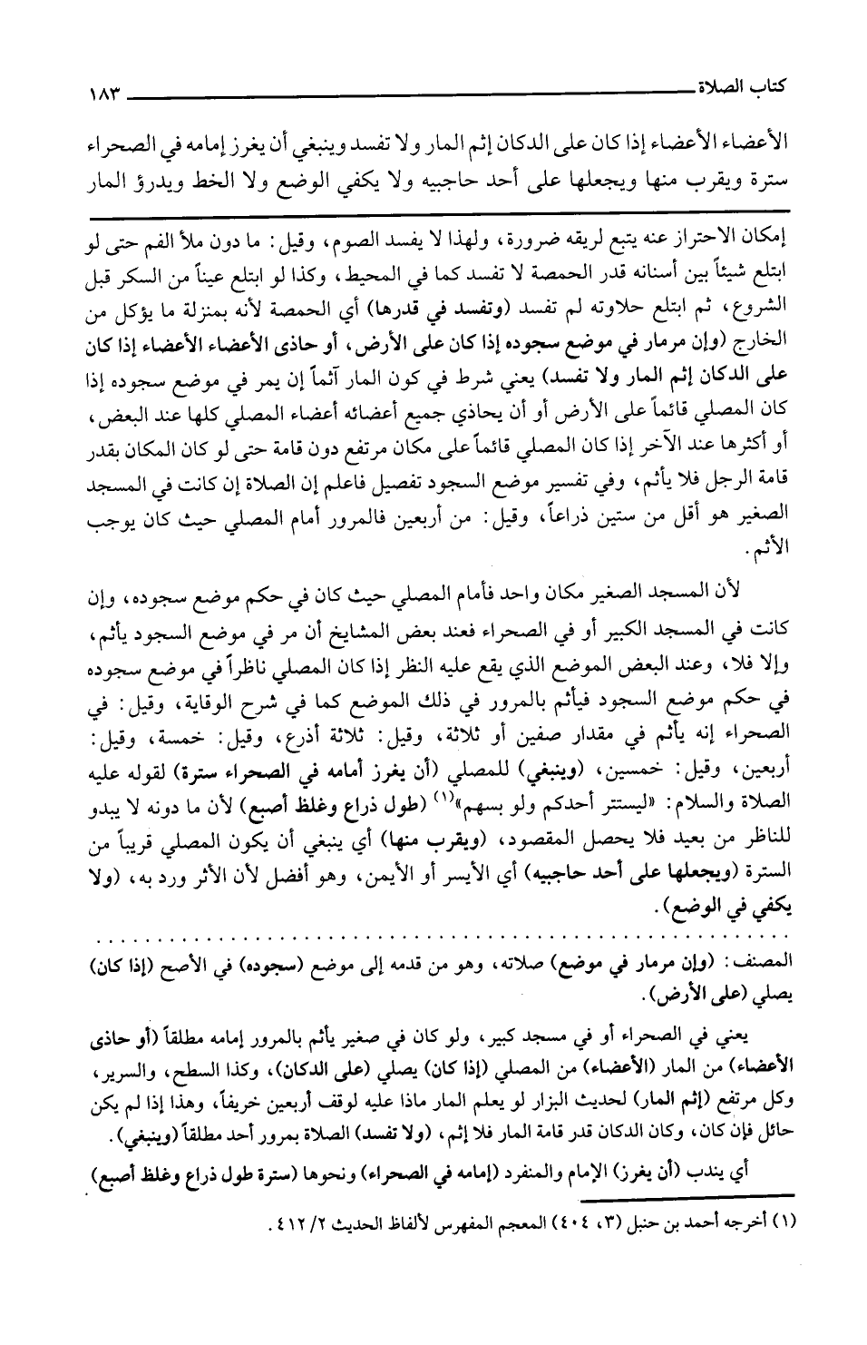 الْأَعْضَاء الْأَعْضَاء إِذا كَانَ على الدّكان أَثم الْمَار وَلَا تفْسد وَيَنْبَغِي أَن يغرز أَمَامه فِي الصَّحرَاء ستْرَة وَيقرب مِنْهَا ويجعلها على أحد حاجبيه وَلَا يَكْفِي الْوَضع وَلَا الْخط ويدرؤ الْمَار