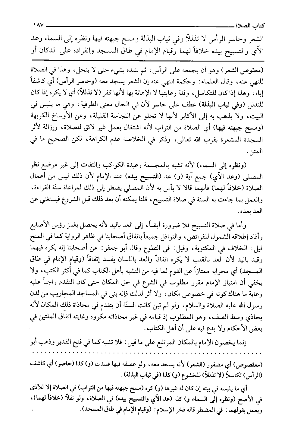 الشّعْر وحاسر الرَّأْس لَا تذللاً وَفِي ثِيَاب البذلة وَمسح جَبهته فِيهَا وَنَظره إِلَى السَّمَاء وعد الْآي وَالتَّسْبِيح بِيَدِهِ خلافًا لَهما وَقيام الإِمَام فِي طاق الْمَسْجِد وانفراده على الدّكان أَو