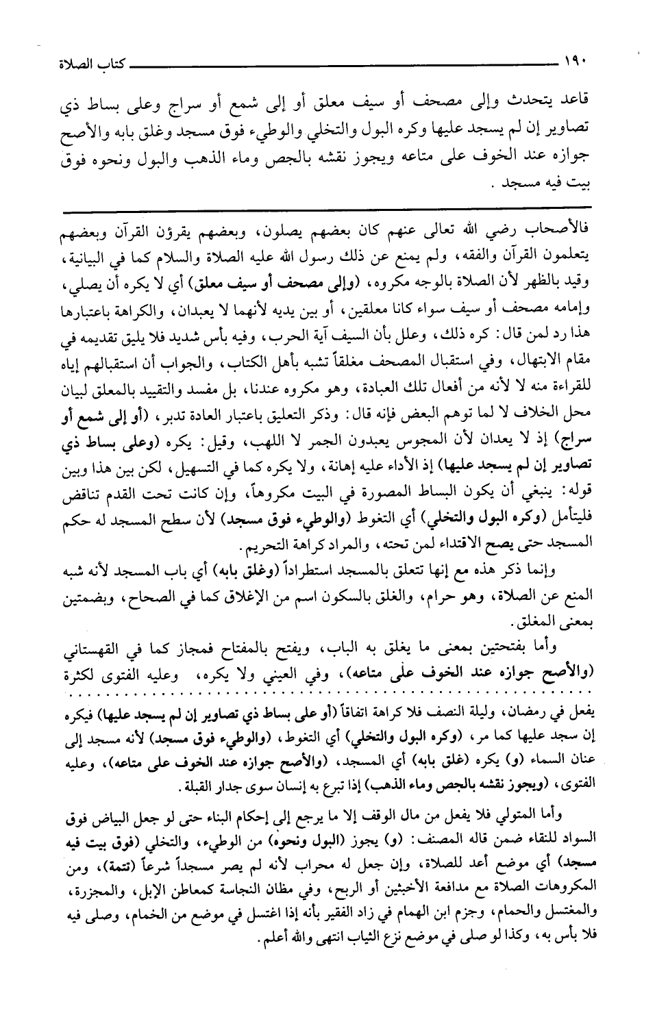 قَاعد يتحدث وَإِلَى مصحف أَو سيف مُعَلّق أَو إِلَى شمع أَو سراج وعَلى بِسَاط ذِي تصاوير إِن لم يسْجد عليهاوكره الْبَوْل والتخلي والوطيء فَوق مَسْجِد وغلق بَابه وَالأَصَح جَوَازه عِنْد الْخَوْف على مَتَاعه وَيجوز نقشه بالجص وَمَاء الذَّهَب وَالْبَوْل وَنَحْوه فَوق بَيت فِيهِ مَسْجِد.
