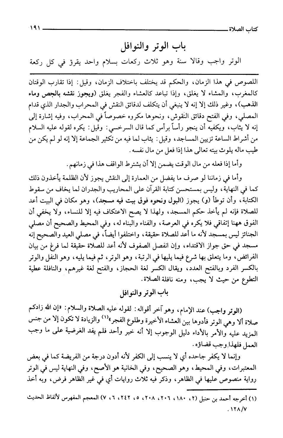 الْوتر وَاجِب وَقَالا سنة وَهُوَ ثَلَاث رَكْعَات بِسَلام وَاحِد يقرؤ فِي كل رَكْعَة