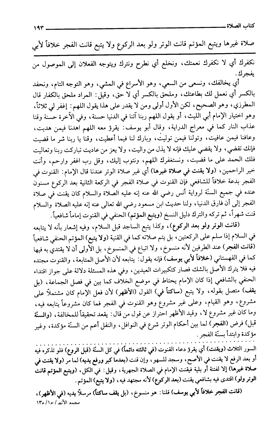 صَلَاة غَيرهَا وَيتبع الْمُؤْتَم قَانِت الْوتر وَلَو بعد الرُّكُوع وَلَا يتبع قَانِت الْفجْر خلافًا لأبي