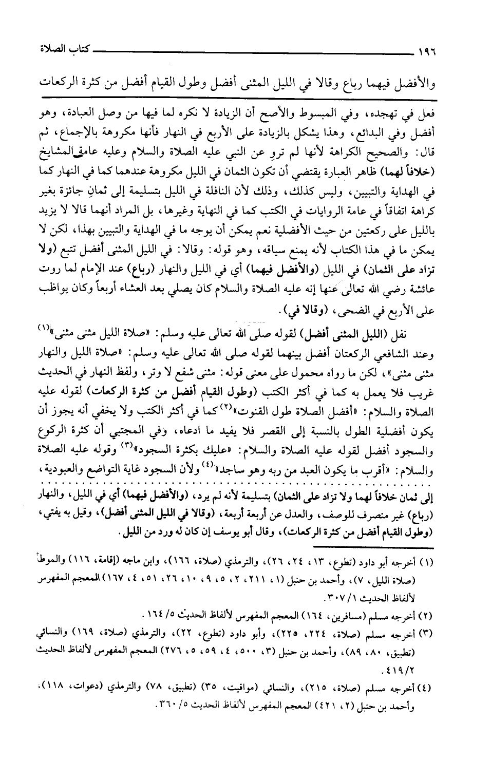 وَالْأَفْضَل فيهمَا رباع وَقَالا فِي اللَّيْل الْمثنى أفضل وَطول الْقيام أفضل من كَثْرَة الرَّكْعَات