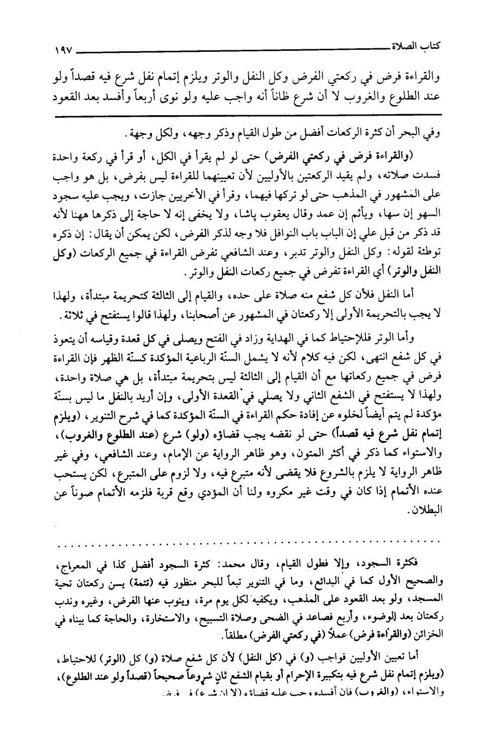 وَالْقِرَاءَة فرض فِي رَكْعَتي الْفَرْض وكل النَّفْل وَالْوتر وَيلْزم إتْمَام نفل شرع فِيهِ قصدا وَلَو عِنْد الطُّلُوع والغروب لَا أَن شرع ظَانّا أَنه وَاجِب عَلَيْهِ وَلَو نوى أَرْبعا وأفسد بعد الْقعُود