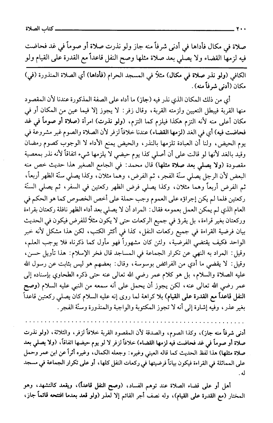 صَلَاة فِي مَكَان فأداها فِي أدنى شرفاً مِنْهُ جَازَ وَلَو نذرت صَلَاة أَو صوما فِي غَد فَحَاضَت فِيهِ لَزِمَهَا الْقَضَاء وَلَا يُصَلِّي بعد صَلَاة مثلهَا وَصَحَّ النَّفْل قَاعِدا مَعَ الْقُدْرَة على الْقيام وَلَو