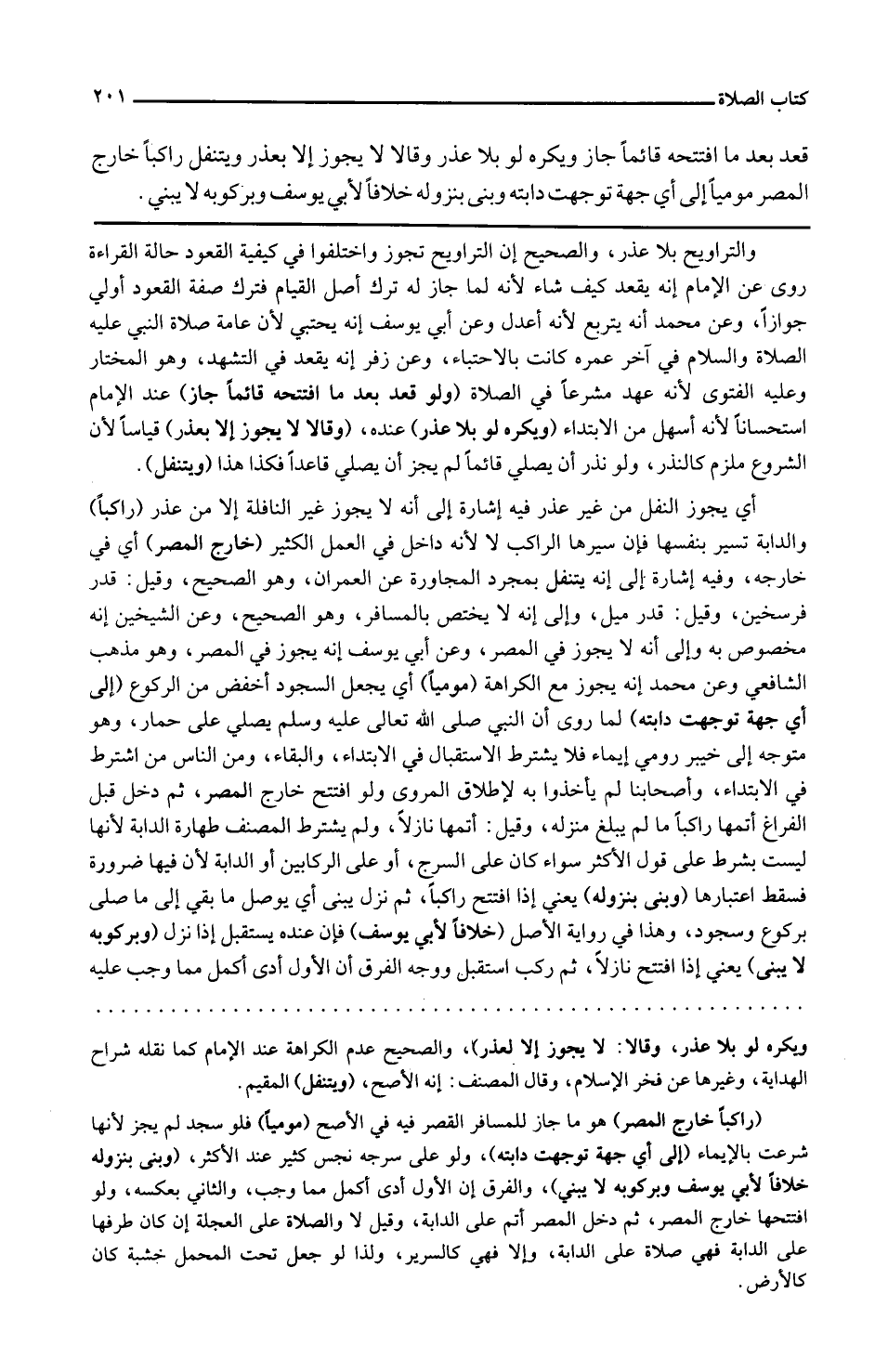 قعد بعد مَا افتتحه قَائِما جَازَ وَيكرهُ لَو بِلَا عذر وَقَالا لَا يجوز إِلَّا بِعُذْر ويتنفل رَاكِبًا خَارج الْمصر مومياً إِلَى أَي جِهَة تَوَجَّهت دَابَّته وَبنى بنزوله خلافًا لأبي يُوسُف وبركوبه لَا يَبْنِي.