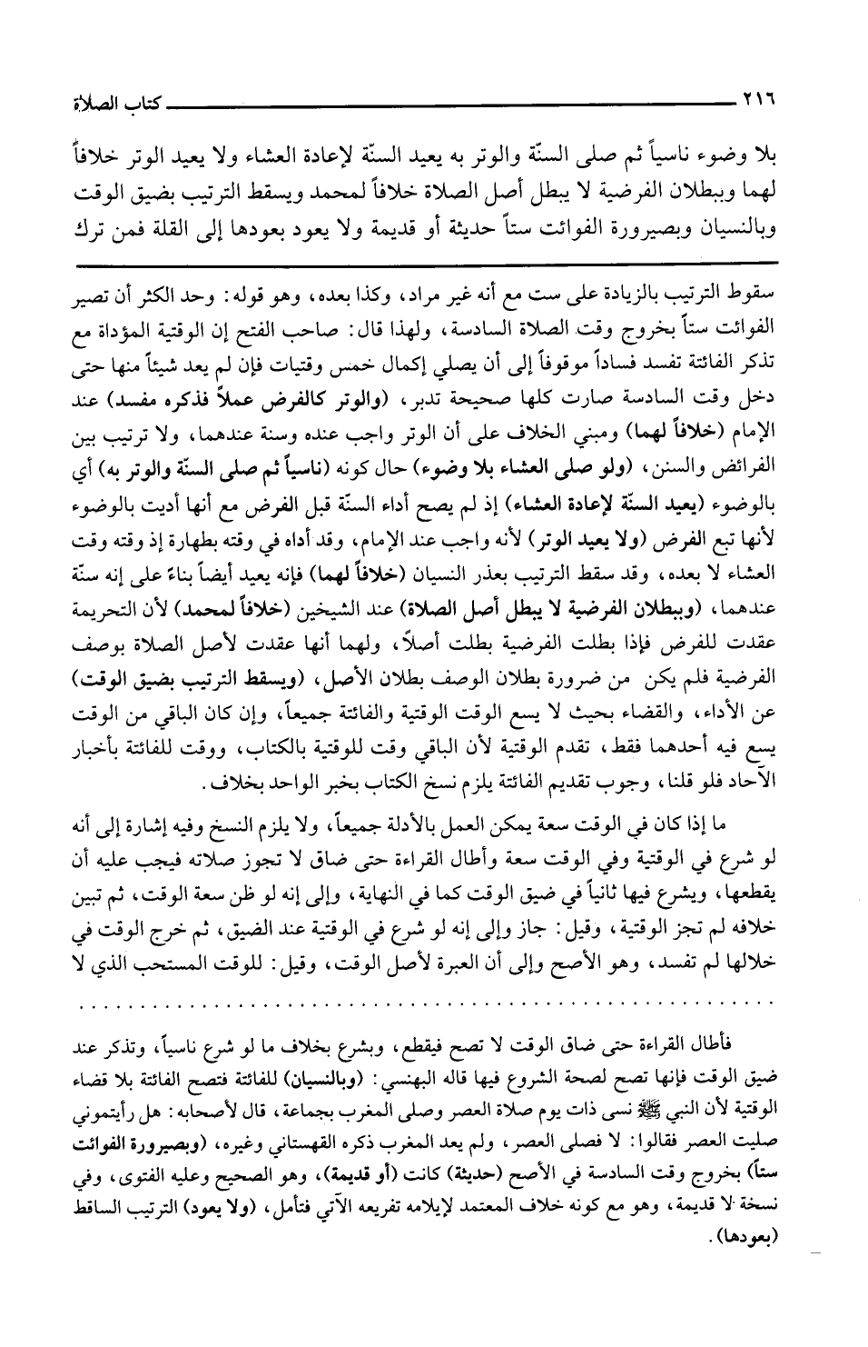 بِلَا وضوء نَاسِيا ثمَّ صلى السنّة وَالْوتر بِهِ يُعِيد لإعادة الْعشَاء وَلَا يُعِيد الْوتر خلافًا لَهما ويبطلان الْفَرْضِيَّة لَا يبطل أصل الصَّلَاة خلافًا لمُحَمد وَيسْقط التَّرْتِيب بِضيق الْوَقْت وبالنسيان وبصيرورة الْفَوَائِت سِتا حَدِيثَة أَو قديمَة وَلَا يعود بعودها إِلَى الْقلَّة فَمن ترك