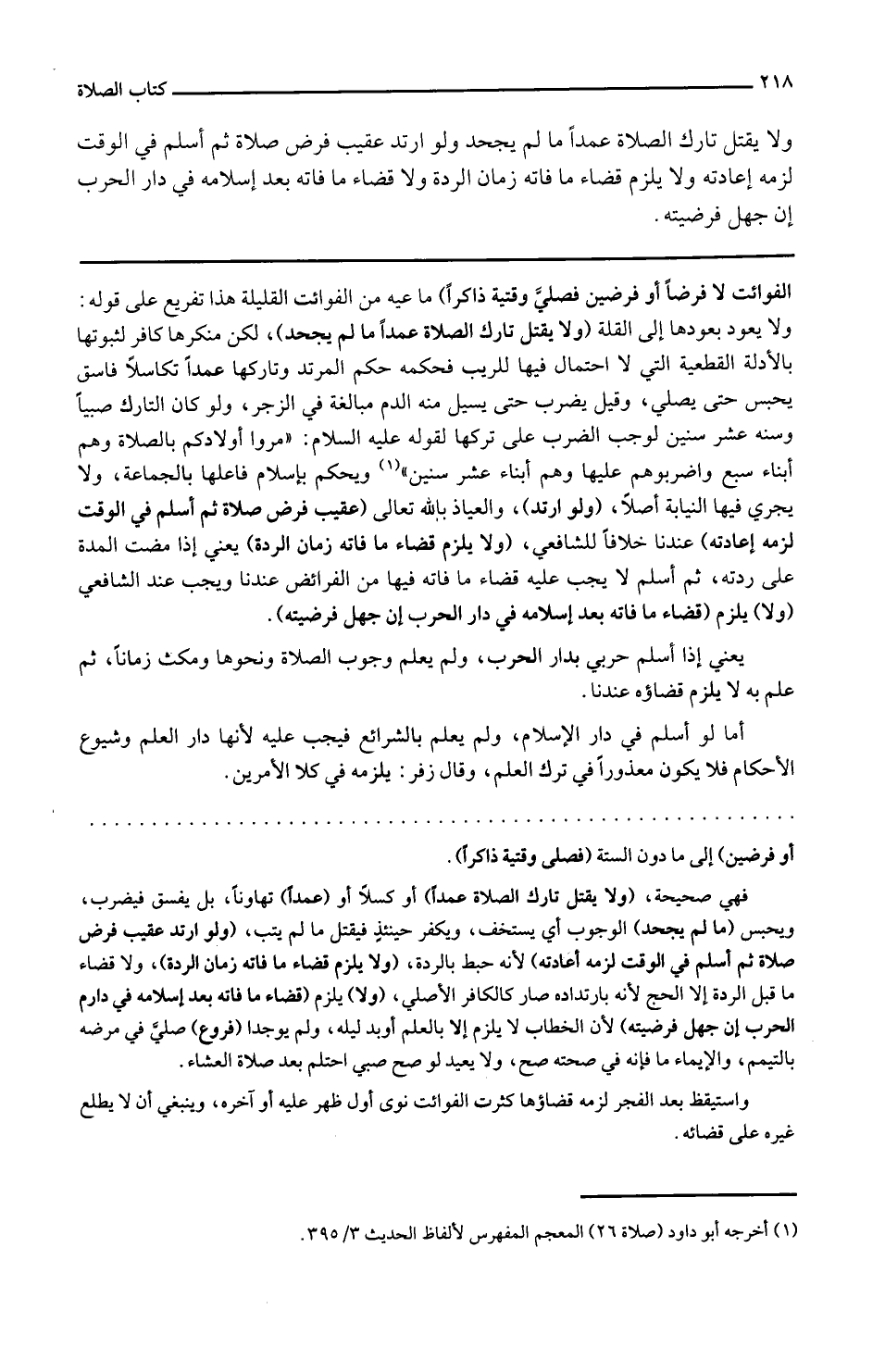 وَلَا يقتل تَارِك الصَّلَاة عمدا مَا لم يجْحَد وَلَو ارْتَدَّ عقيب فرض صَلَاة ثمَّ أسلم فِي الْوَقْت لزمَه إِعَادَته وَلَا يلْزم قَضَاء مَا فَاتَهُ زمَان الرِّدَّة وَلَا قَضَاء مَا فَاتَهُ بعد إِسْلَامه فِي دَار الْحَرْب إِن جهل فرضيته.