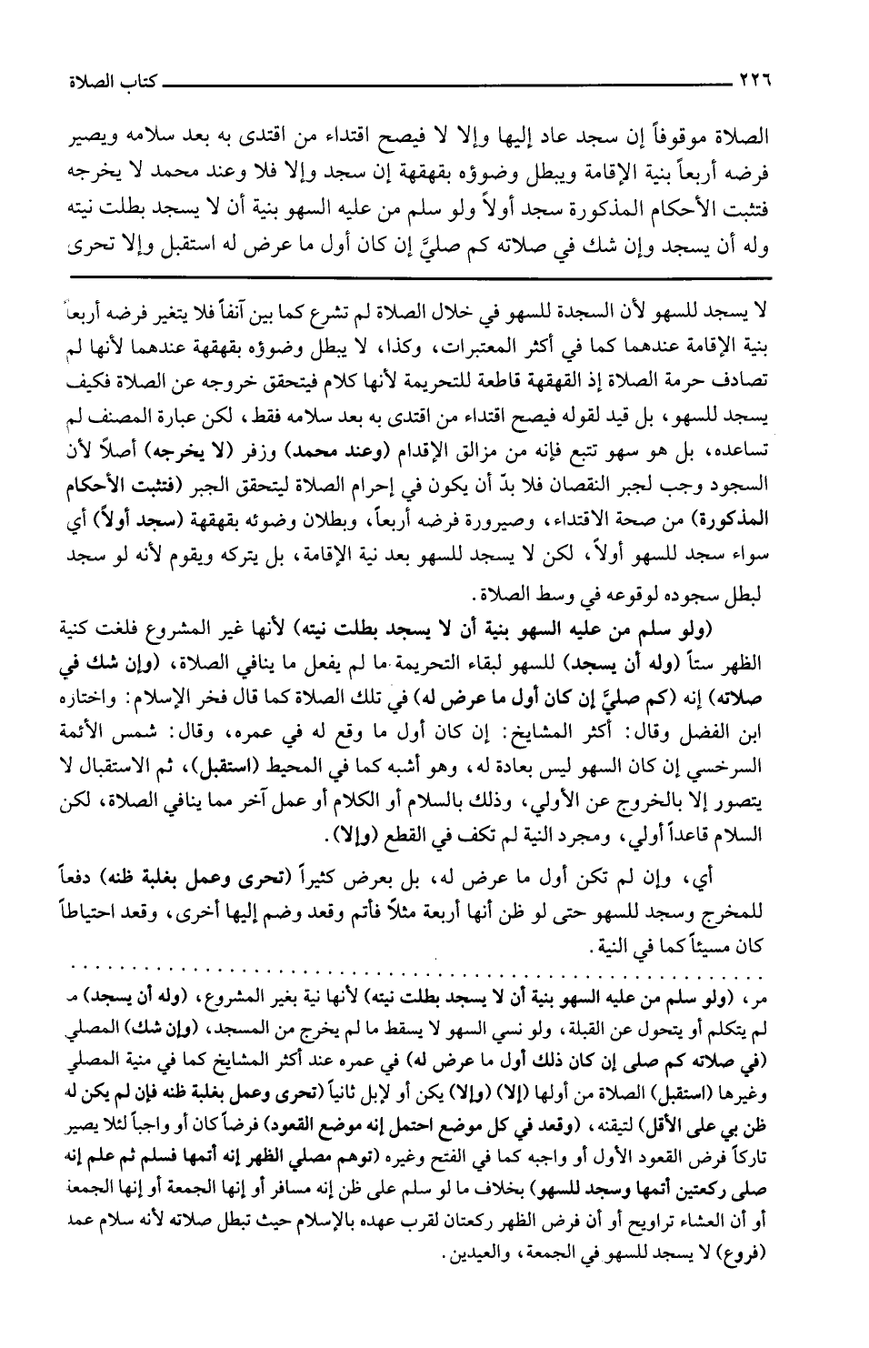 الصَّلَاة مَوْقُوفا إِن سجد عَاد إِلَيْهَا وَإِلَّا لَا فَيصح اقْتِدَاء من اقْتدى بِهِ بعد سَلَامه وَيصير فَرْضه أَرْبعا بنية الْإِقَامَة وَيبْطل وضوؤه بقهقهة إِن سجد وَإِلَّا فَلَا وَعند مُحَمَّد لَا يُخرجهُ فَتثبت الأحاكم الْمَذْكُورَة سجد أَو لَا وَلَو سلم من عَلَيْهِ السَّهْو بنية أَن لَا يسْجد بطلت نِيَّته وَله أَن يسْجد وَإِن شكّ فِي صلَاته كم صليَّ إِن كَانَ أول مَا عرض لَهُ اسْتقْبل وَإِلَّا تحرى