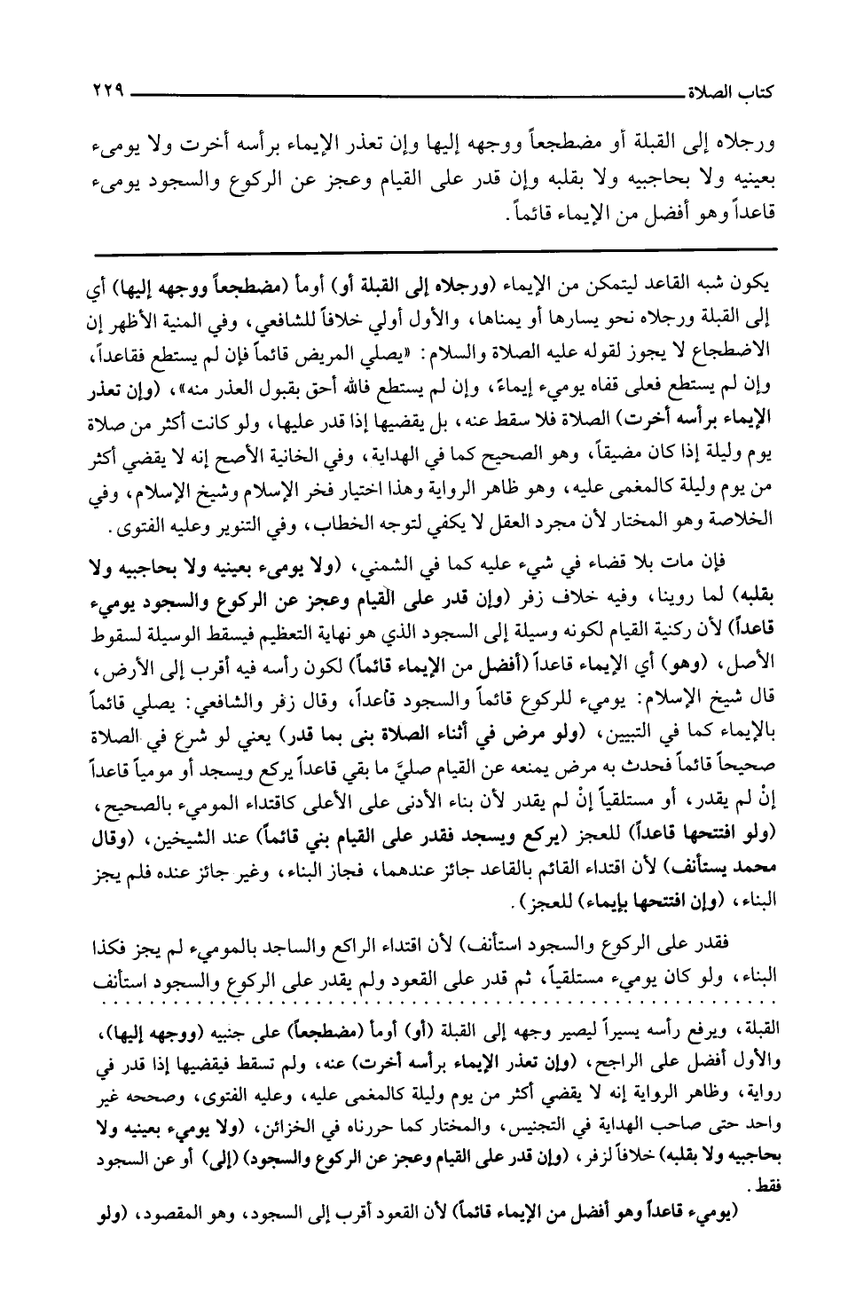 وَرجلَاهُ إِلَى الْقبْلَة أَو مُضْطَجعا وَوَجهه إِلَيْهَا وَإِن تعذر الْإِيمَاء بِرَأْسِهِ أخرت وَلَا يومىء بِعَيْنيهِ وَلَا بحاجبيه وَلَا بِقَلْبِه وَإِن قدر على الْقيام وَعجز عَن الرُّكُوع وَالسُّجُود يومىء قَاعِدا وَهُوَ أفضل من الْإِيمَاء قَائِما.