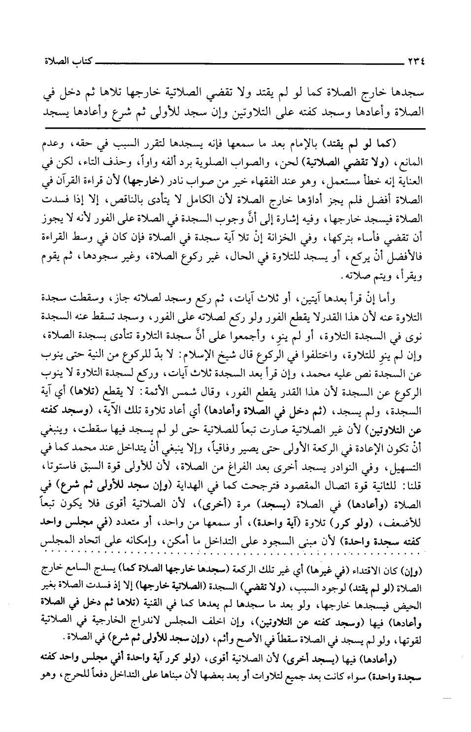 سجدها خَارج الصَّلَاة كَمَا لَو لم يقتد وَلَا تقضي الصلاتية خَارِجهَا تَلَاهَا ثمَّ دخل فِي الصَّلَاة وأعادها وَسجد كفته على التلاوتين وَإِن سجد للأولى ثمَّ شرع وأعادها يسْجد