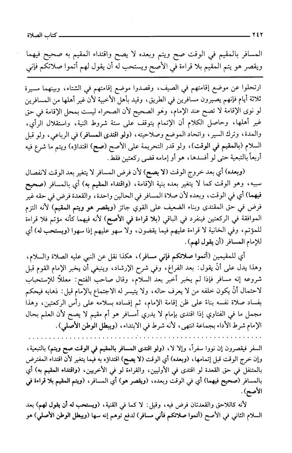 الْمُسَافِر بالمقيم فِي الْوَقْت صَحَّ وَيتم وَبعده لَا يَصح واقتداء الْمُقِيم بِهِ صَحِيح فيهمَا وَيقصر هُوَ يتم الْمُقِيم بِلَا قِرَاءَة فِي الْأَصَح وَيسْتَحب لَهُ أَن يَقُول لَهُم أَتموا صَلَاتكُمْ فَإِنِّي