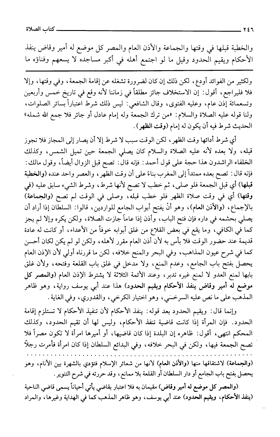 وَالْخطْبَة قبلهَا فِي وَقتهَا وَالْجَمَاعَة وَالْأُذن الْعَام والمصر كل مَوضِع لَهُ أَمِير وقاض ينفذ الأحام ويقين الْحُدُود وَقيل مَا لَو اجْتمع أَهله فِي أكبر مساجده لَا يسعهم وفناؤه مَا