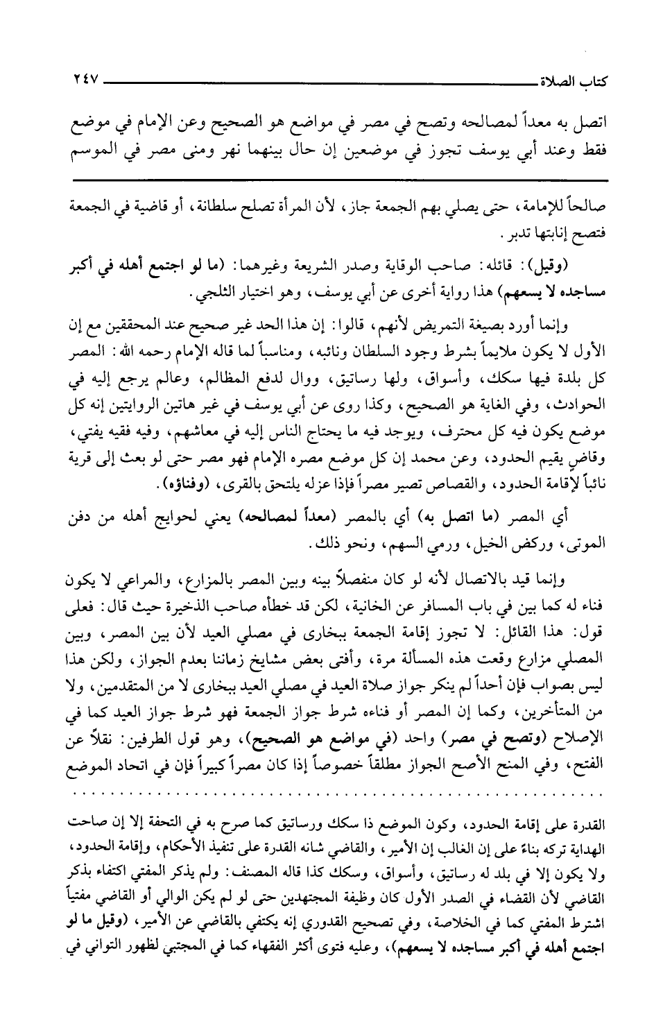 اتَّصل بِهِ معداً لمصالحه وَتَصِح فِي مصر فِي مَوَاضِع هُوَ الصَّحِيح وَعَن الإِمَام فِي مَوضِع فَقَط وَعند أبي يُوسُف تجوز فِي موضِعين إِن حَال بَينهمَا نهر وَمنى مصر فِي الْمَوْسِم