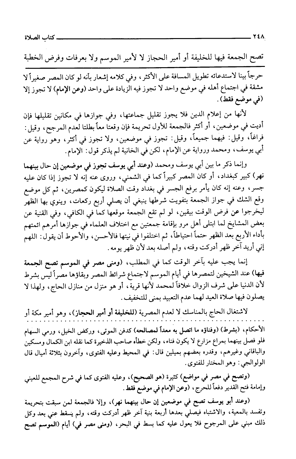 تصح الْجُمُعَة فِيهَا للخليفة أَو أَمِير الْحجاز لَا لأمير الْمَوْسِم وَلَا بِعَرَفَات وَفرض الْخطْبَة