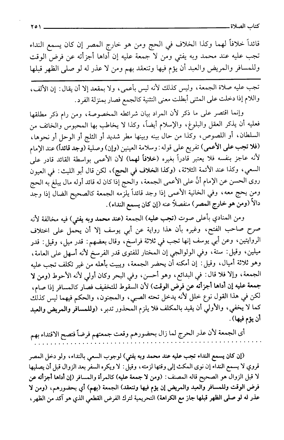 قائداً خلافًا لَهما وَكَذَا الْخلاف فِي الْحَج وَمن هُوَ خَارج الْمصر إِن كَانَ يسمع النداء تجب عَلَيْهِ عِنْد مُحَمَّد وَبِه يُفْتِي وَمن لَا جُمُعَة عَلَيْهِ إِن أَدَّاهَا أَجْزَأته عَن فرض الْوَقْت وللمسافر وَالْمَرِيض وَالْعَبْد أَن يؤم فِيهَا وتنعقد بهم وَمن لَا عذر لَهُ لَو صلى الظّهْر قبلهَا