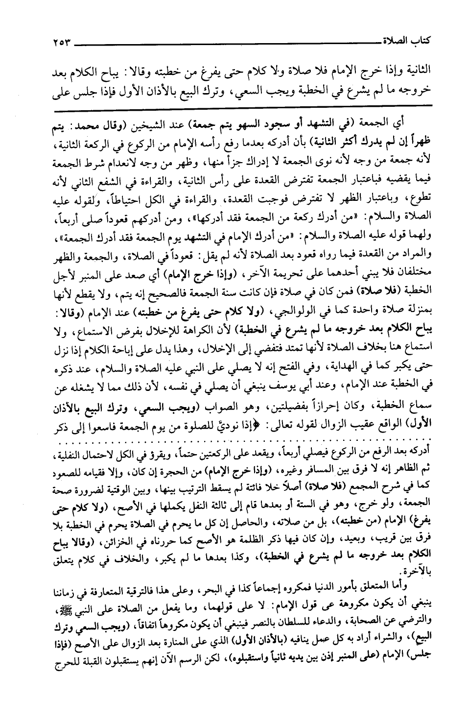 الثَّانِيَة وَإِذا خرج الإِمَام فَلَا صُورَة وَلَا كَلَام حَتَّى يفرغ من خطبَته وَقَالا: يُبَاح الْكَلَام بعد خُرُوجه مَا لم يشرع فِي الْخطْبَة وَيجب السَّعْي، وَترك البيع بِالْأَذَانِ الأول فَإِذا جلس على