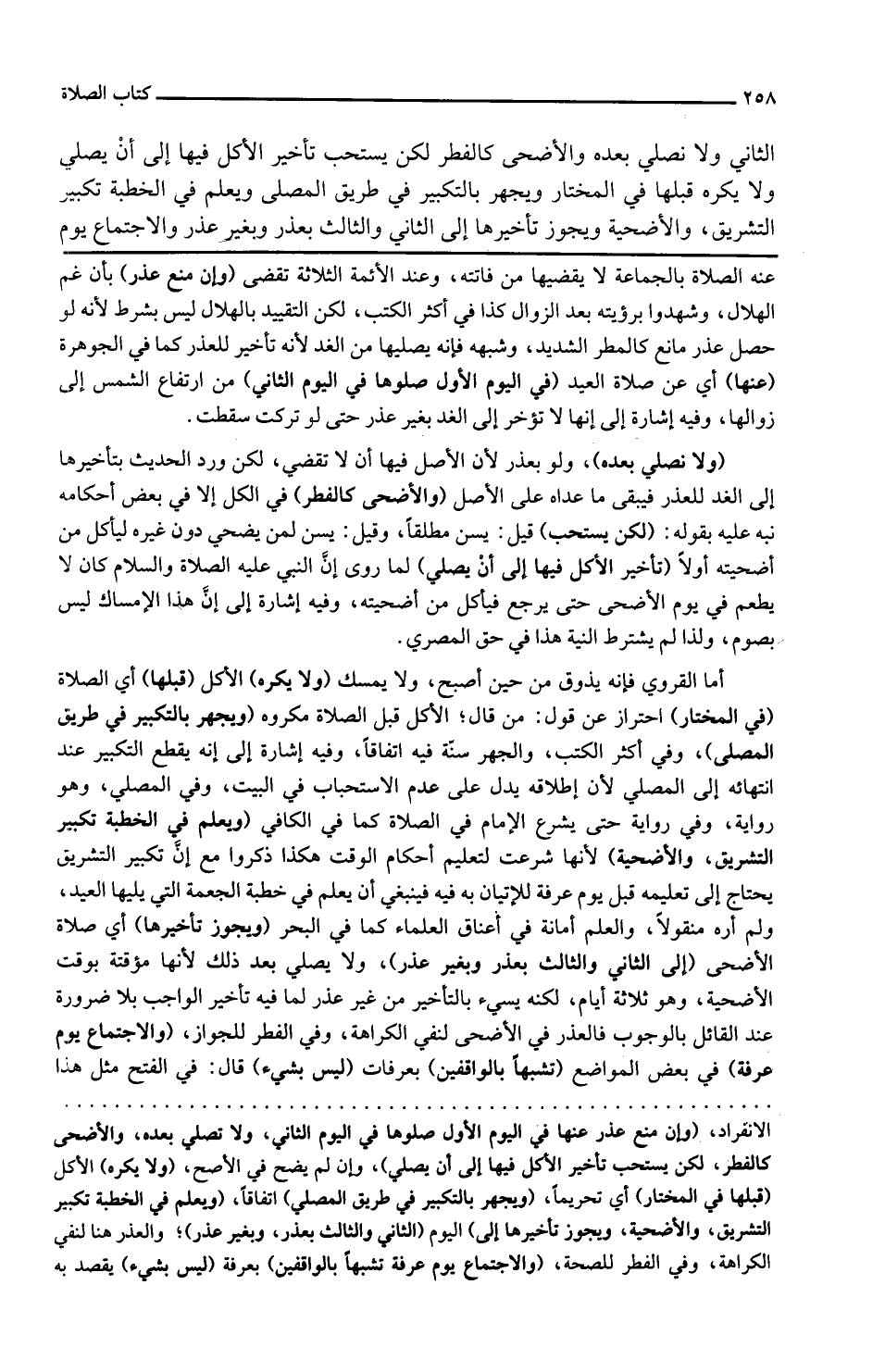 الثَّانِي وَلَا نصلي بعده والأضحى كالفطر لَكِن يسْتَحبّ تَأْخِير الْأكل فِيهَا إِلَى أنْ يُصَلِّي وَلَا يكره قبلهَا فِي الْمُخْتَار ويجهر بِالتَّكْبِيرِ فِي طَرِيق الْمصلى وَيعلم فِي الْخطْبَة تَكْبِير التَّشْرِيق، وَالْأُضْحِيَّة وَيجوز تَأْخِيرهَا إِلَى الثَّانِي وَالثَّالِث بِعُذْر وَبِغير عذر والاجتماع يَوْم