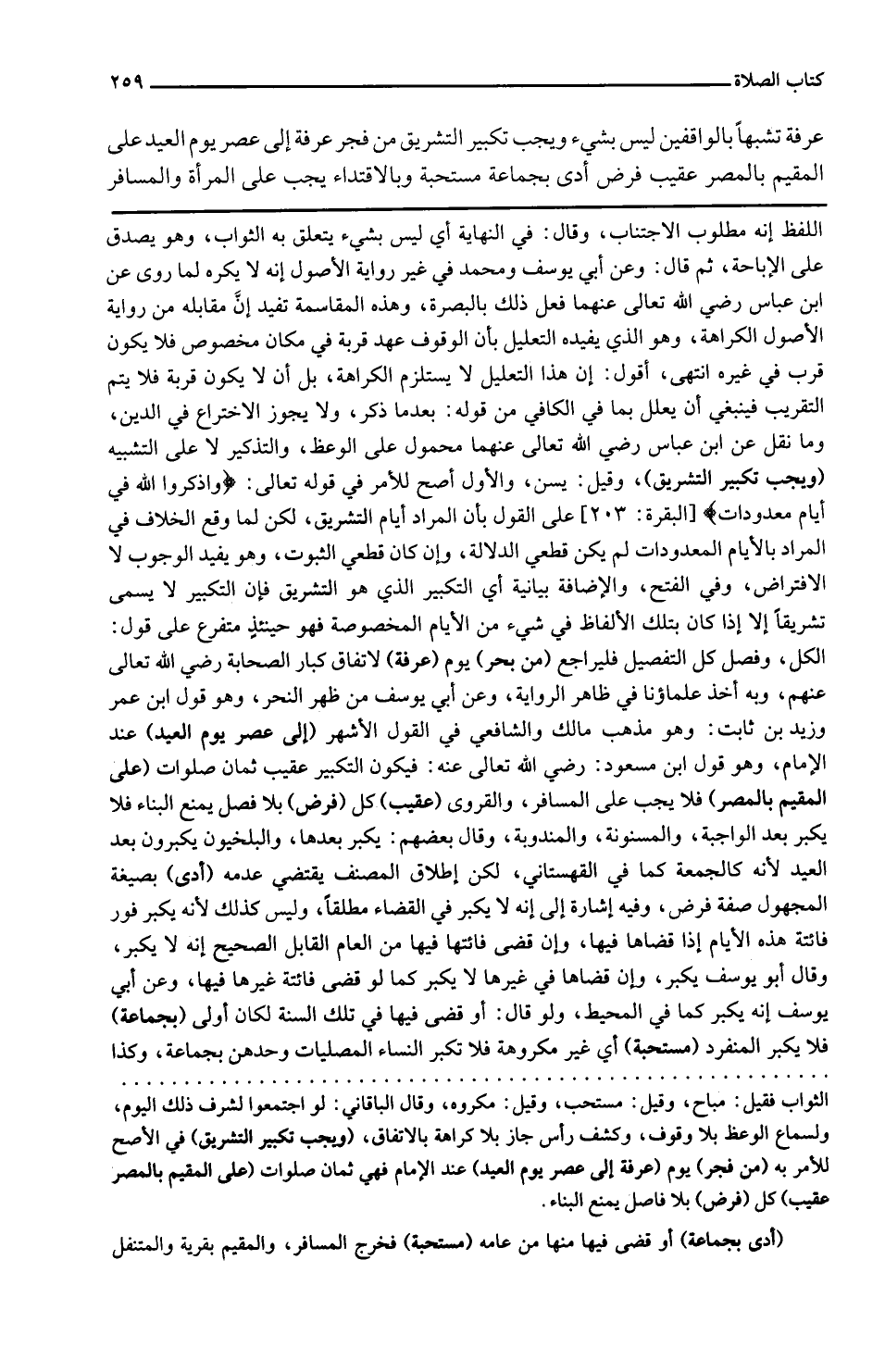 عَرَفَة تشبهاً بالواقفين لَيْسَ بِشَيْء وَيجب تَكْبِير التَّشْرِيق من فجر عَرَفَة إِلَى عصر يَوْم الْعِيد على الْمُقِيم بِالْمِصْرِ عقيب فرض أدّى بِجَمَاعَة مُسْتَحبَّة وبالاقتداء يجب على الْمَرْأَة وَالْمُسَافر