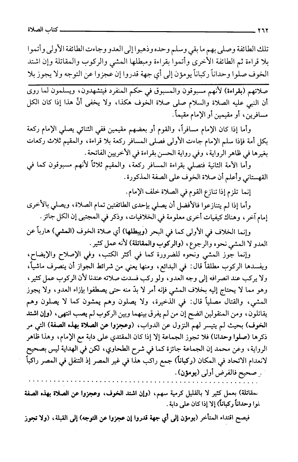 تِلْكَ الطَّائِفَة وَصلى بهم مَا بَقِي وَسلم وَحده وذهبوا إِلَى الْعَدو وَجَاءَت الطَّائِفَة الأولى وَأَتمُّوا بِلَا قِرَاءَة ثمَّ الطَّائِفَة الْأُخْرَى وَأَتمُّوا بِقِرَاءَة ومبطلها الْمَشْي وَالرُّكُوب والمقاتلة وَإِن اشْتَدَّ الْخَوْف صلوا وحداناً ركباناً يومؤن إِلَى أَي جِهَة قدرُوا إِن عجزوا عَن التَّوَجُّه وَلَا يجوز بِلَا