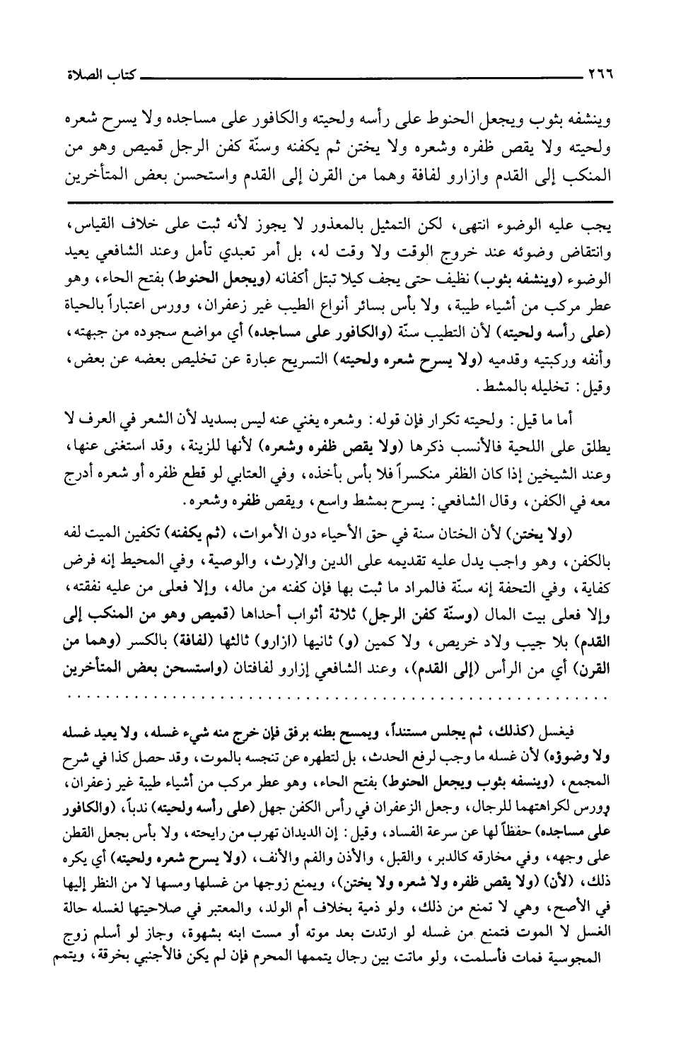 وينشفه بِثَوْب وَيجْعَل الحنوط على رَأسه ولحيته والكافور على مساجده وَلَا يسرح شعره وليحته وَلَا يقص ظفره وشعره وَلَا يختن ثمَّ يُكَفِّنهُ وسنّة كفن الرجل قَمِيص وَهُوَ من الْمنْكب إِلَى الْقدَم وازارو لفافة وهما من الْقرن إِلَى الْقدَم وَاسْتحْسن بعض الْمُتَأَخِّرين