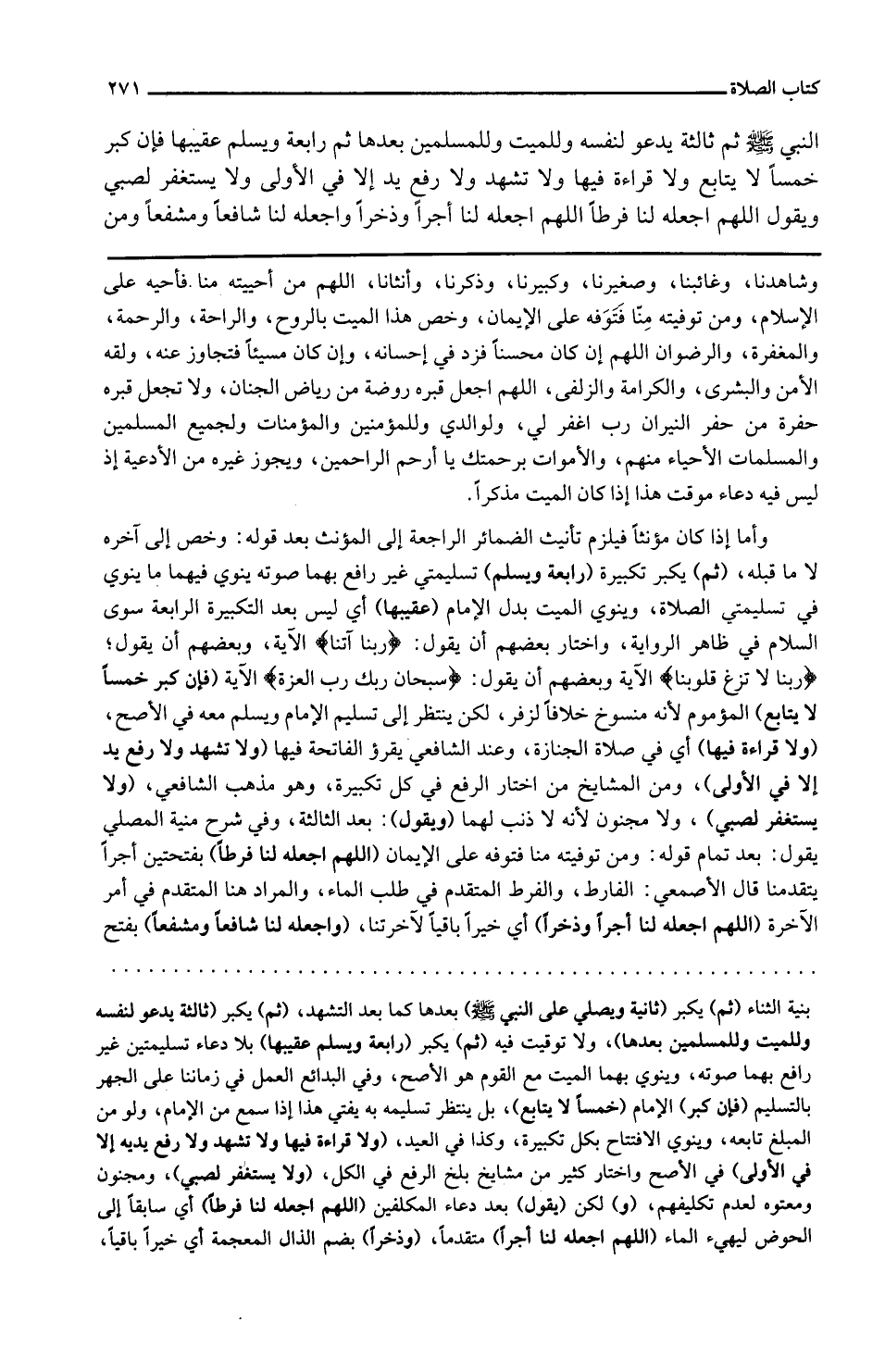 النَّبِي ثمَّ ثَالِثَة يَدْعُو لنَفسِهِ وللميت وللمسلمين بعْدهَا ثمَّ رَابِعَة وَيسلم عقيبها فَإِن كبر خمْسا لَا يُتَابع وَلَا قِرَاءَة فِيهَا وَلَا تشهد وَلَا رفع يَد إِلَّا فِي الأولى وَلَا يسْتَغْفر لصبي وَيَقُول اللَّهُمَّ اجْعَلْهُ لنا فرطا اللَّهُمَّ اجْعَلْهُ لنا أجرا وذخراً واجعله لنا شافعاً ومشفعاً وَمن