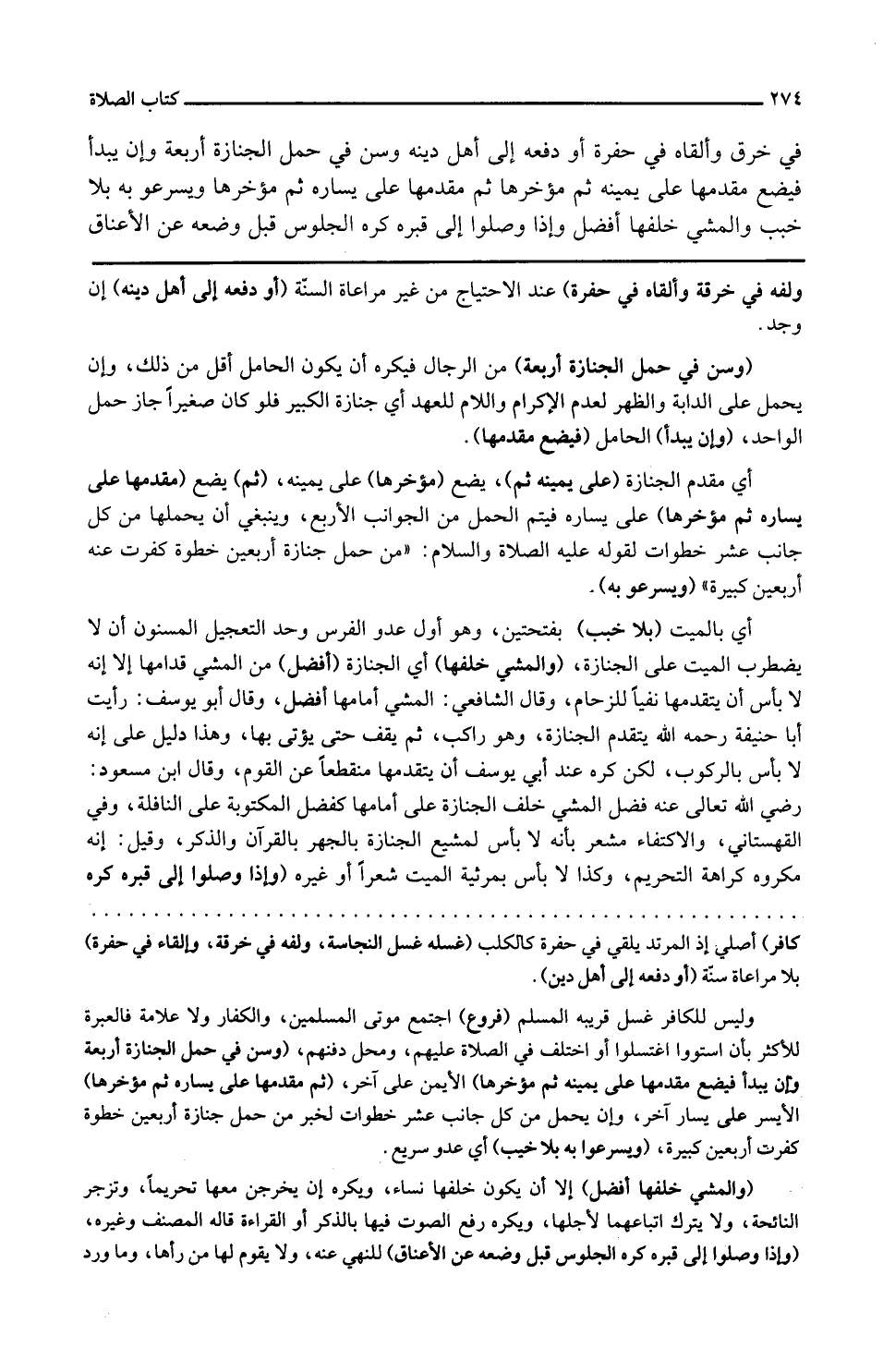 فِي خرق وألقاه فِي حُفْرَة أَو دَفعه إِلَى أهل دينه وَسن فِي حمل الْجِنَازَة أَرْبَعَة وَإِن يبْدَأ فَيَضَع مقدمها على يَمِينه ثمَّ مؤخرها ثمَّ مقدمها على يسَاره ثمَّ مؤخرها ويسرعوا بِهِ بِلَا خبب وَالْمَشْي خلفهَا أفضل وَإِذا وصلوا إِلَى قَبره كره الْجُلُوس قبل وَضعه عَن الْأَعْنَاق