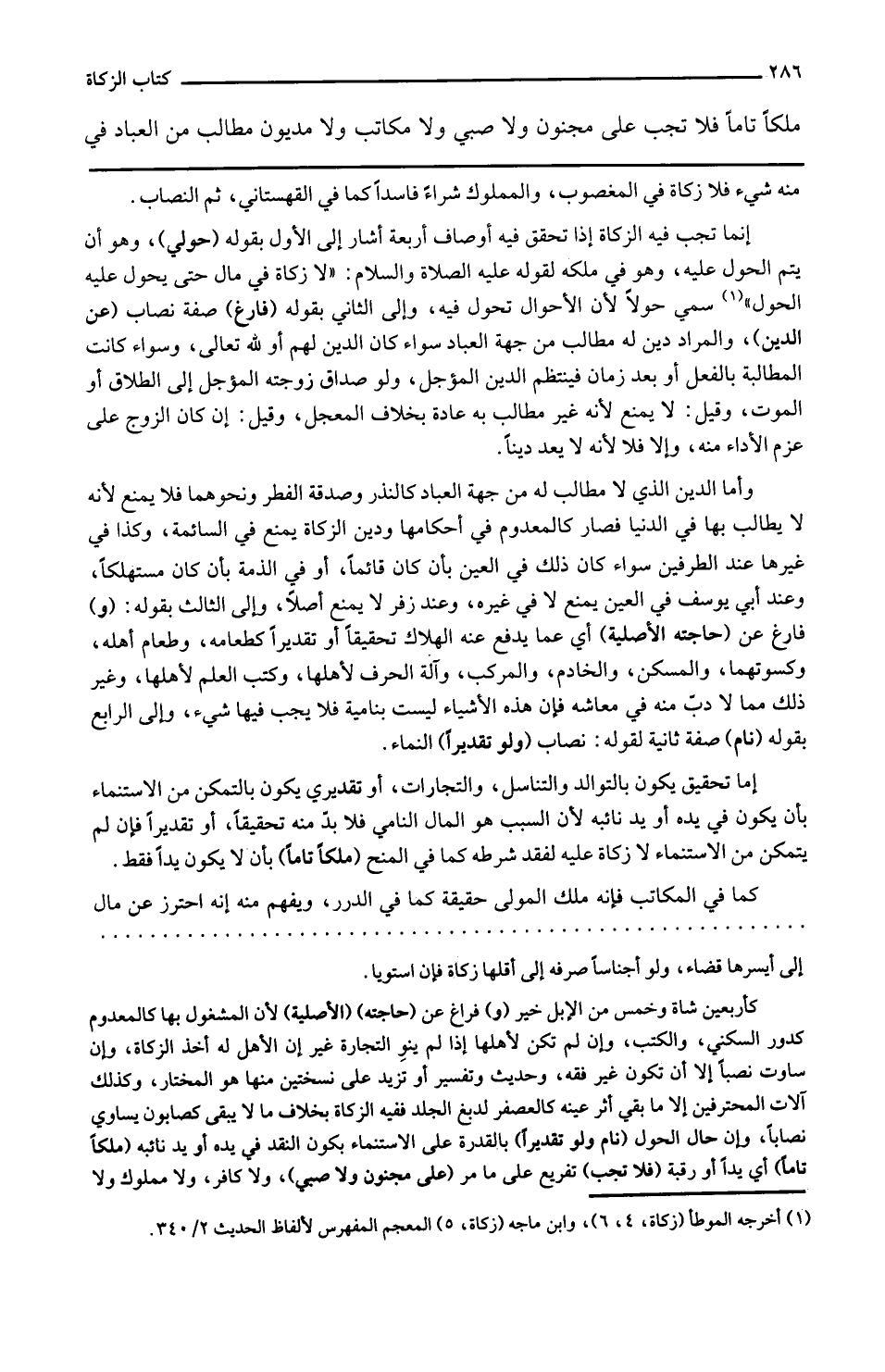 ملكا تَاما فَلَا تجب على مَجْنُون وَلَا صبي وَلَا مكَاتب وَلَا مديون مطَالب من الْعباد فِي