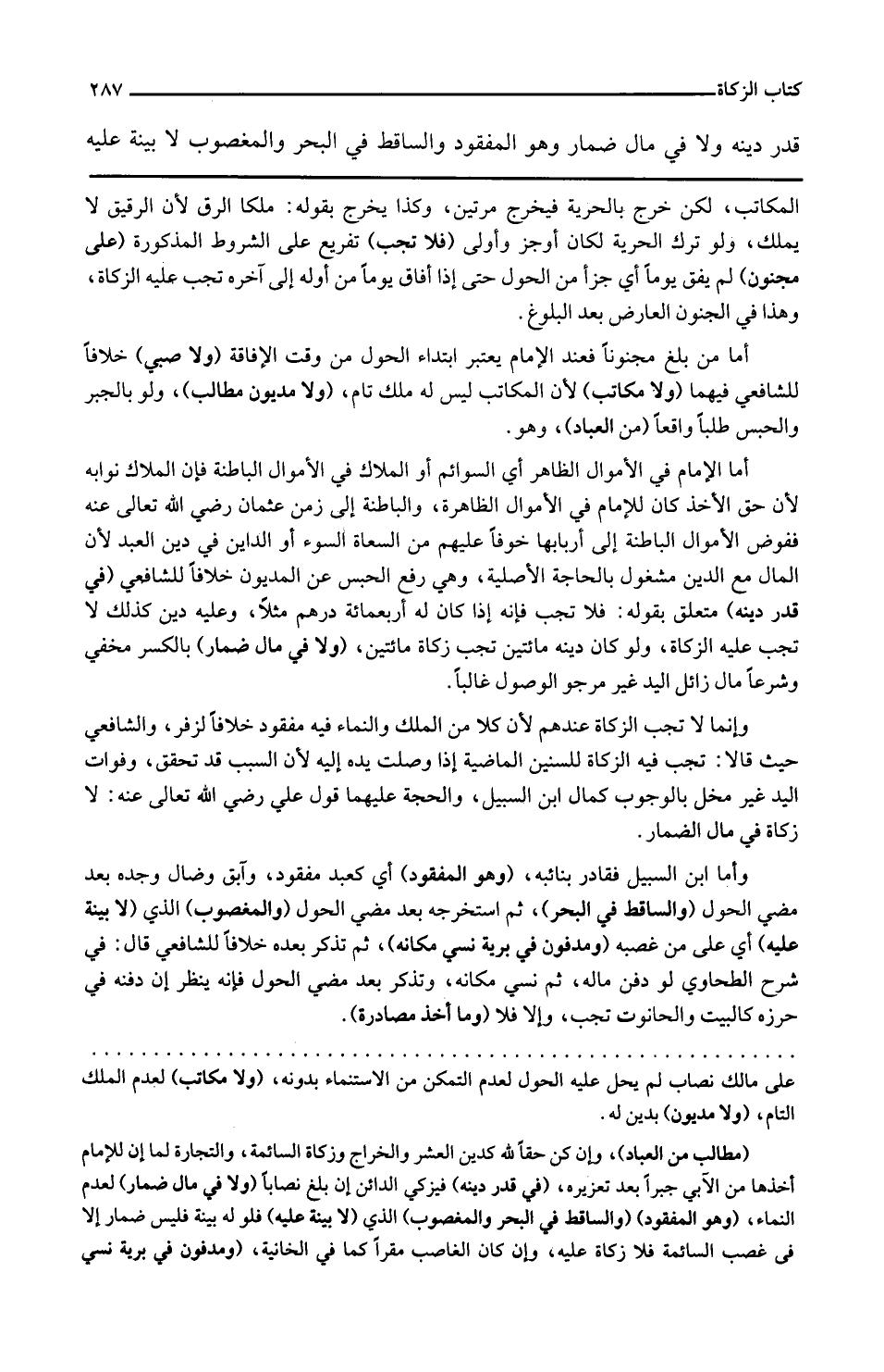 قدر دينه وَلَا فِي مَال ضمار وَهُوَ الْمَفْقُود والساقط فِي الْبَحْر وَالْمَغْصُوب لَا بَيِّنَة عَلَيْهِ